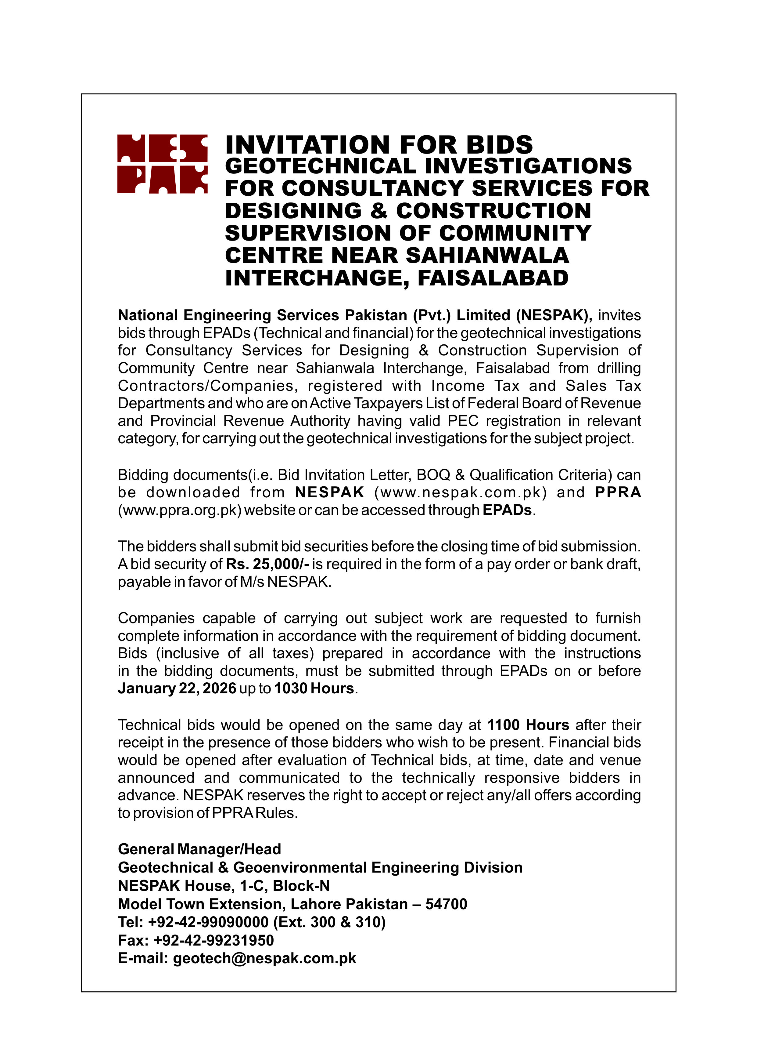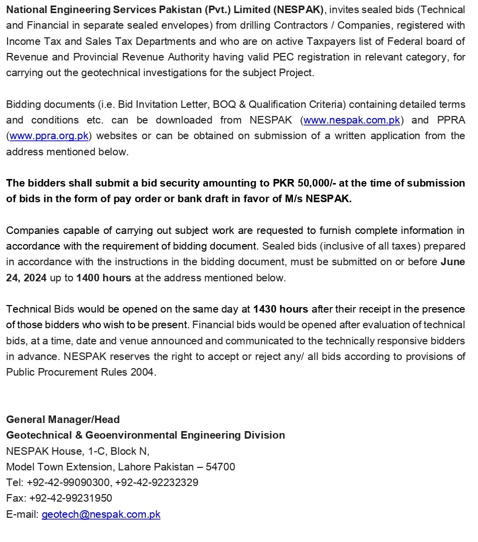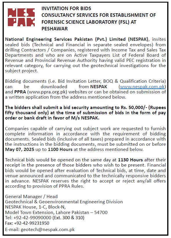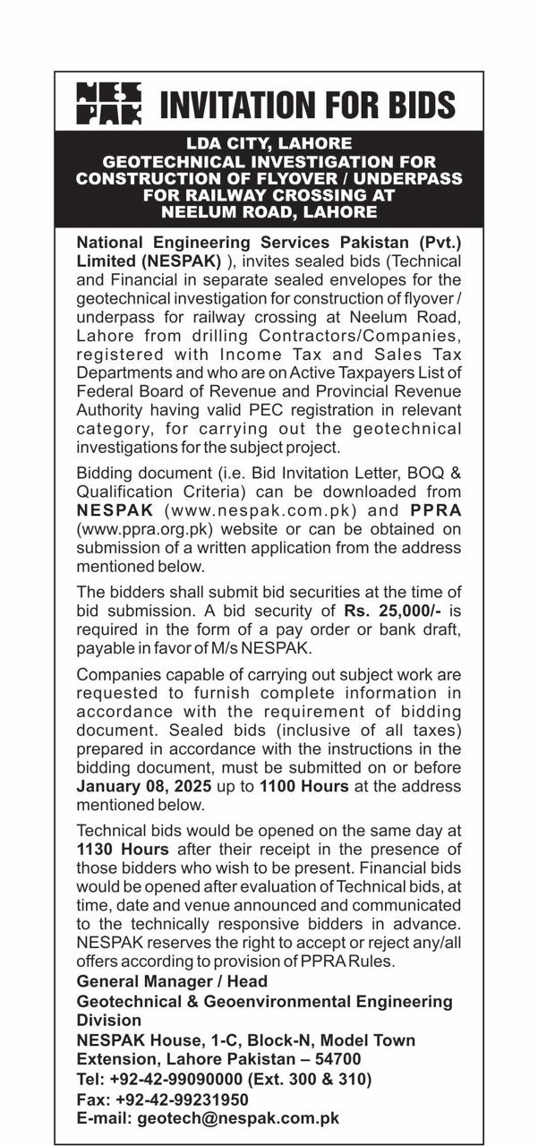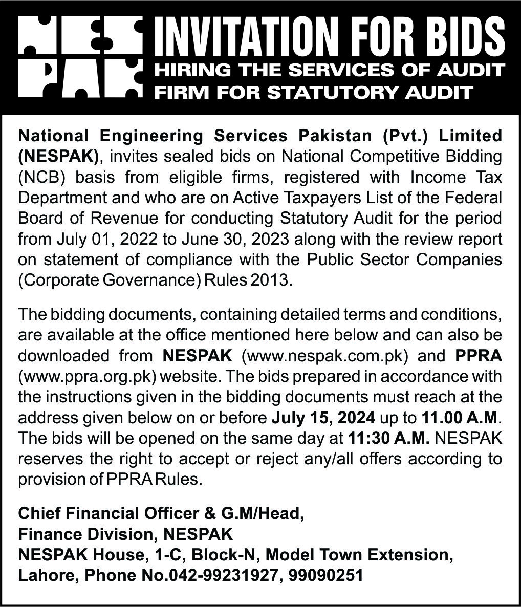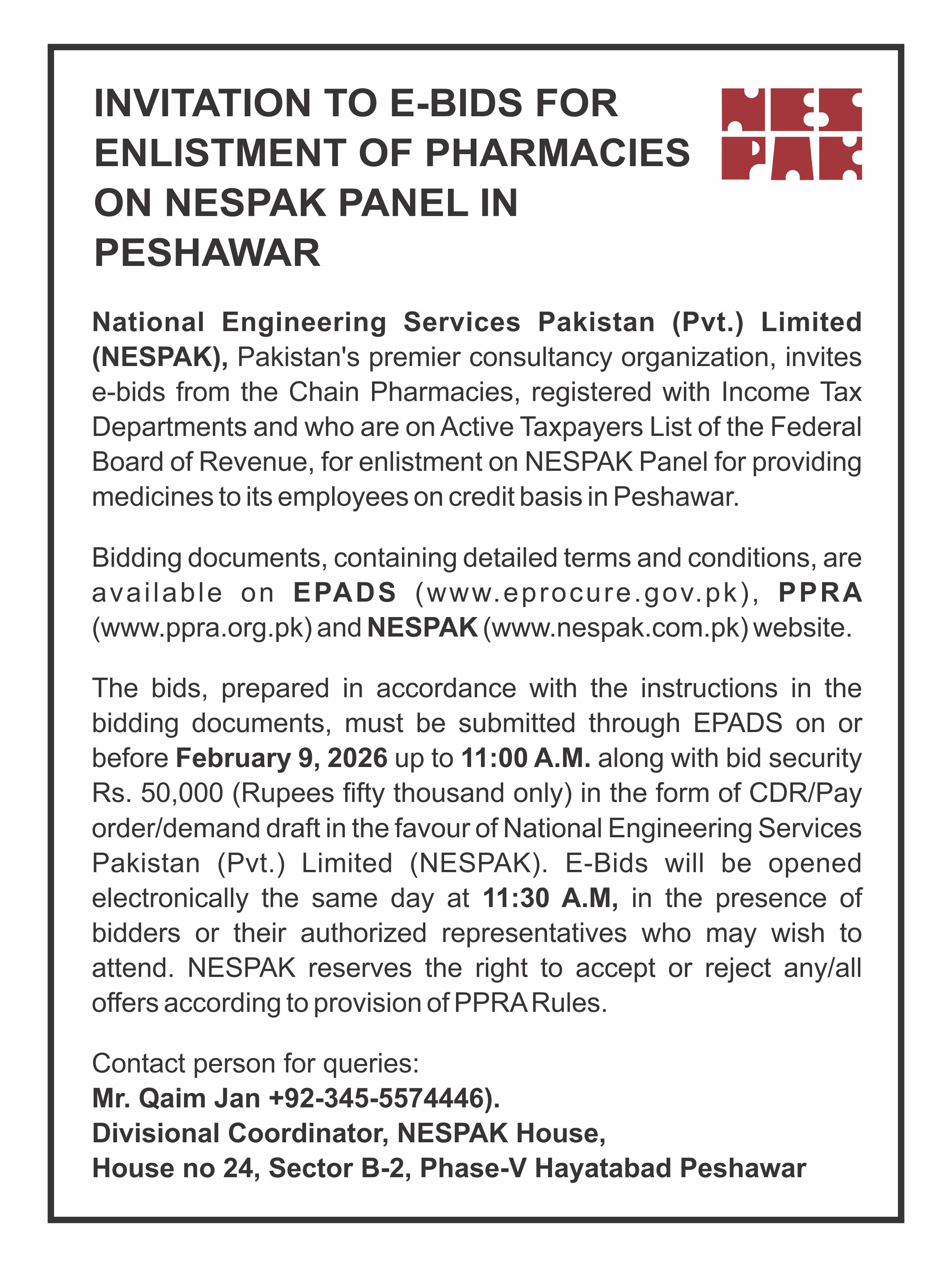 INVITATION FOR BIDS -ENLISTMENT OF PHARMACIES ON NESPAK PANEL IN LAHORE
