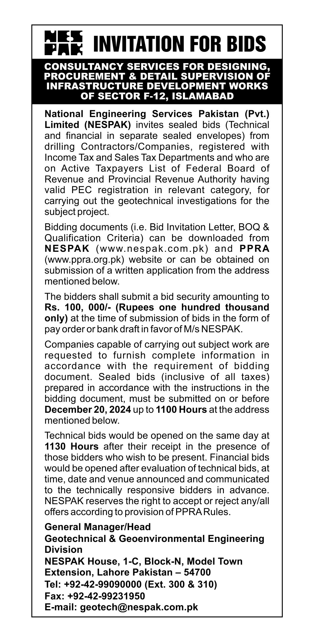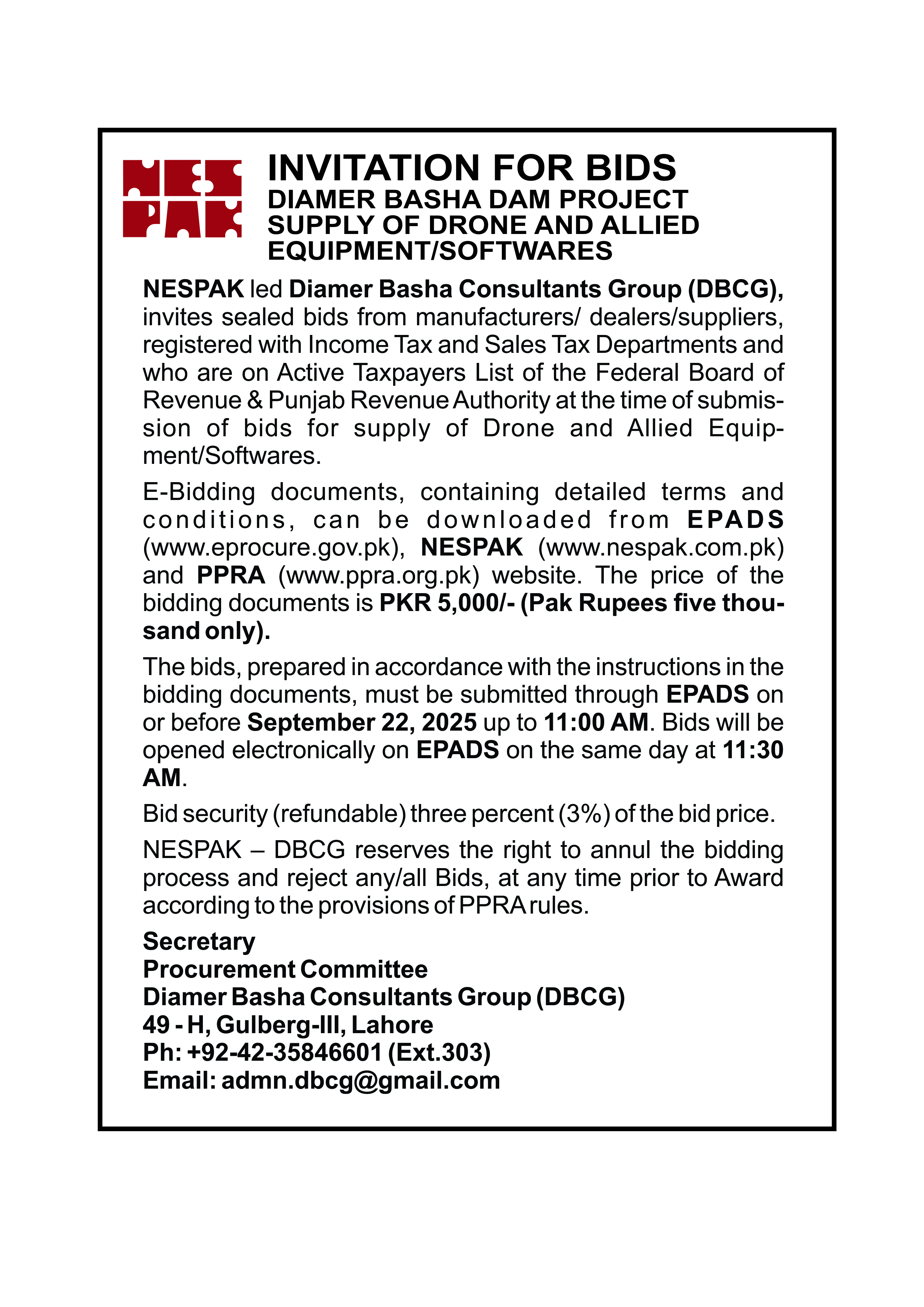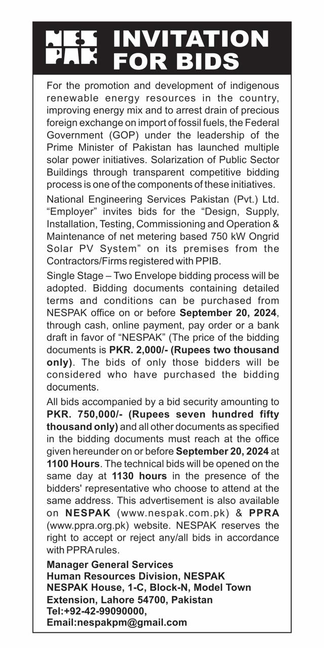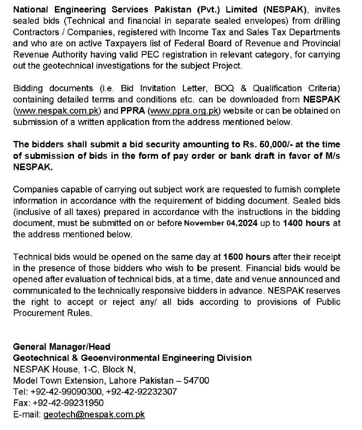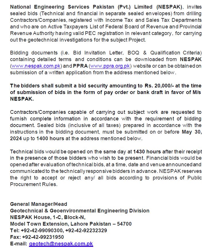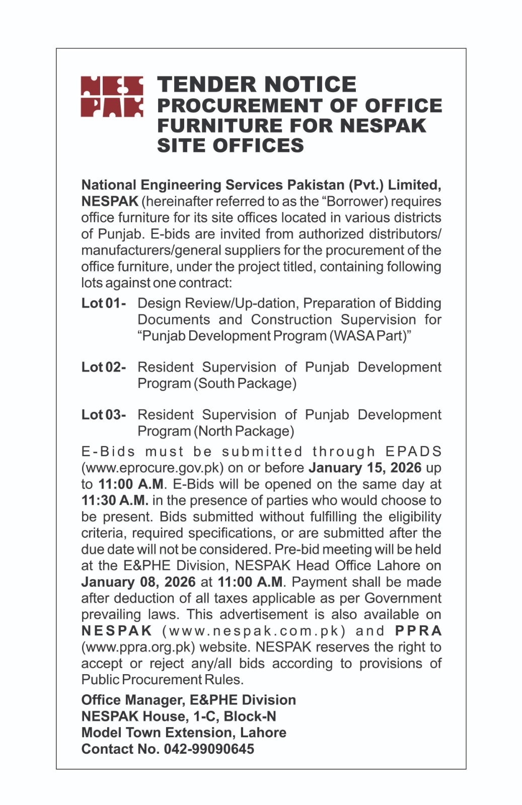 INVITATION FOR BIDS -ENLISTMENT OF PHARMACIES ON NESPAK PANEL IN LAHORE