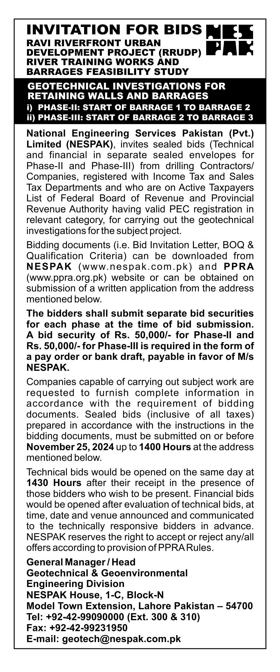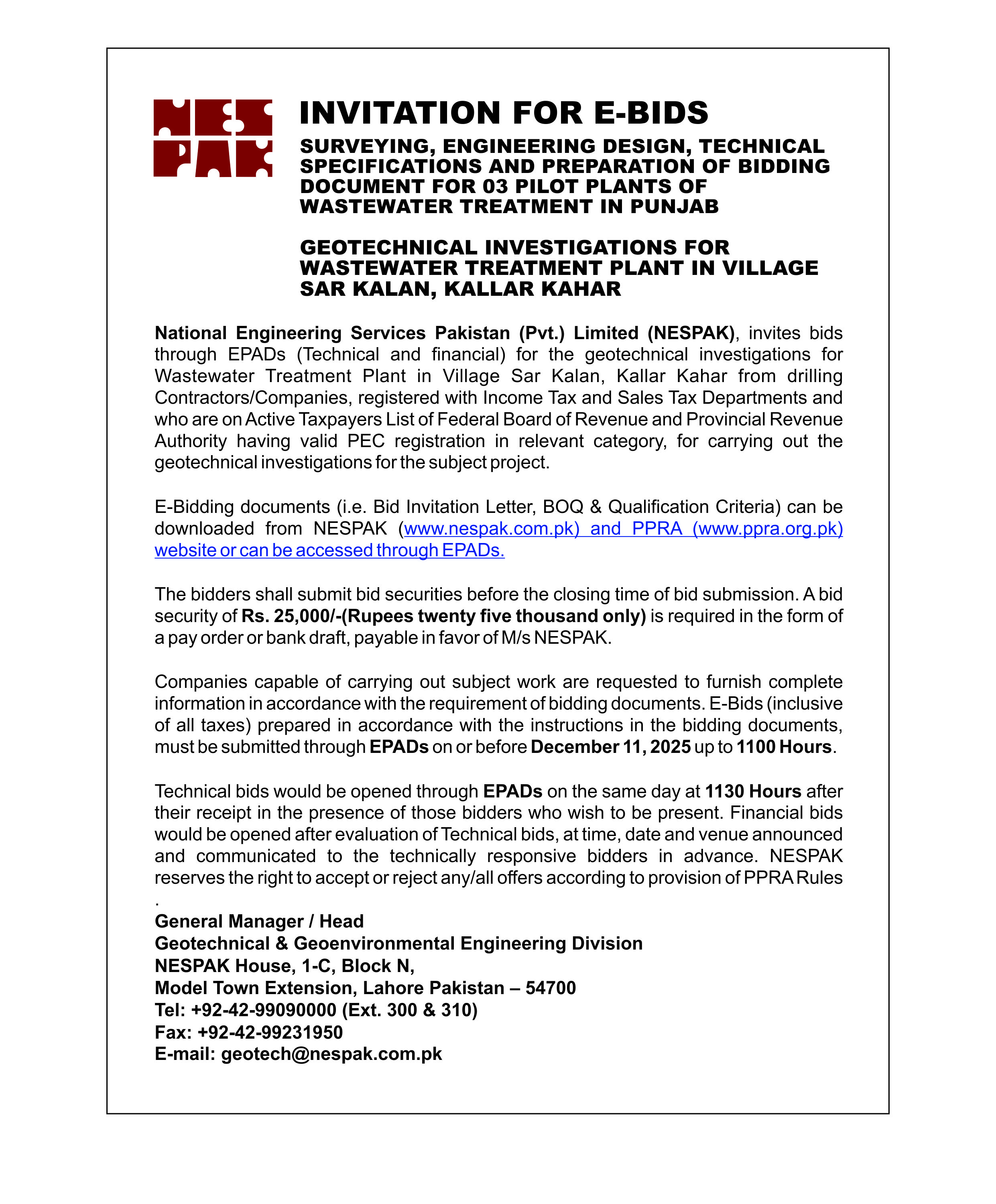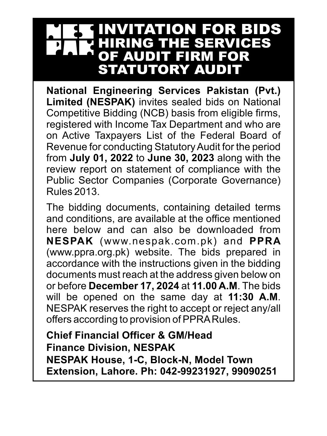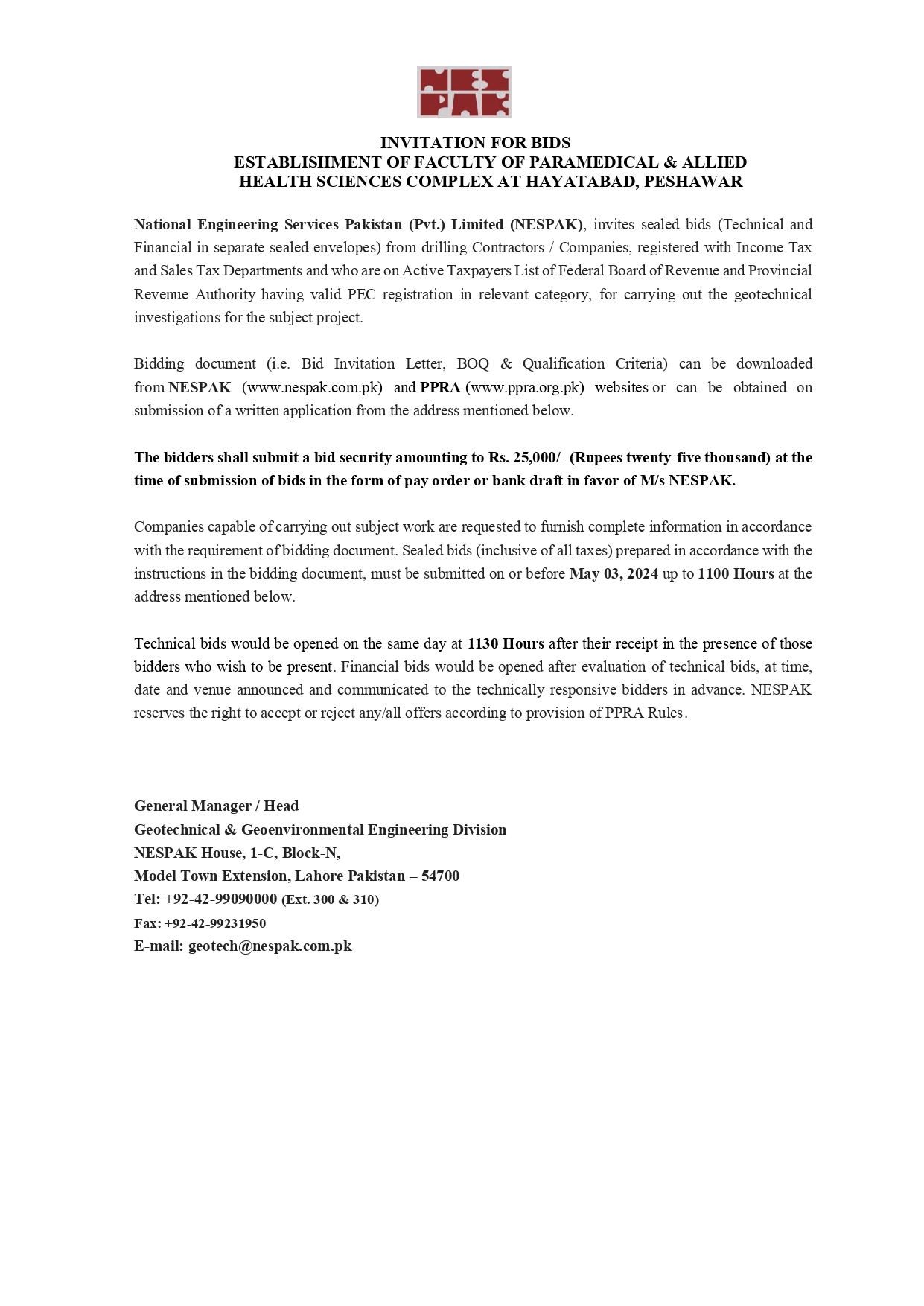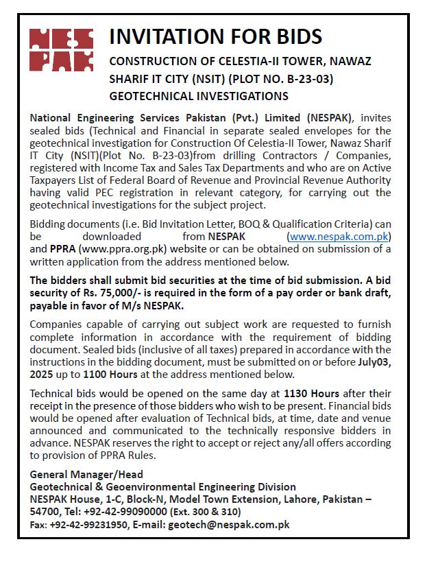 INVITATION FOR BIDS -ENLISTMENT OF PHARMACIES ON NESPAK PANEL IN LAHORE