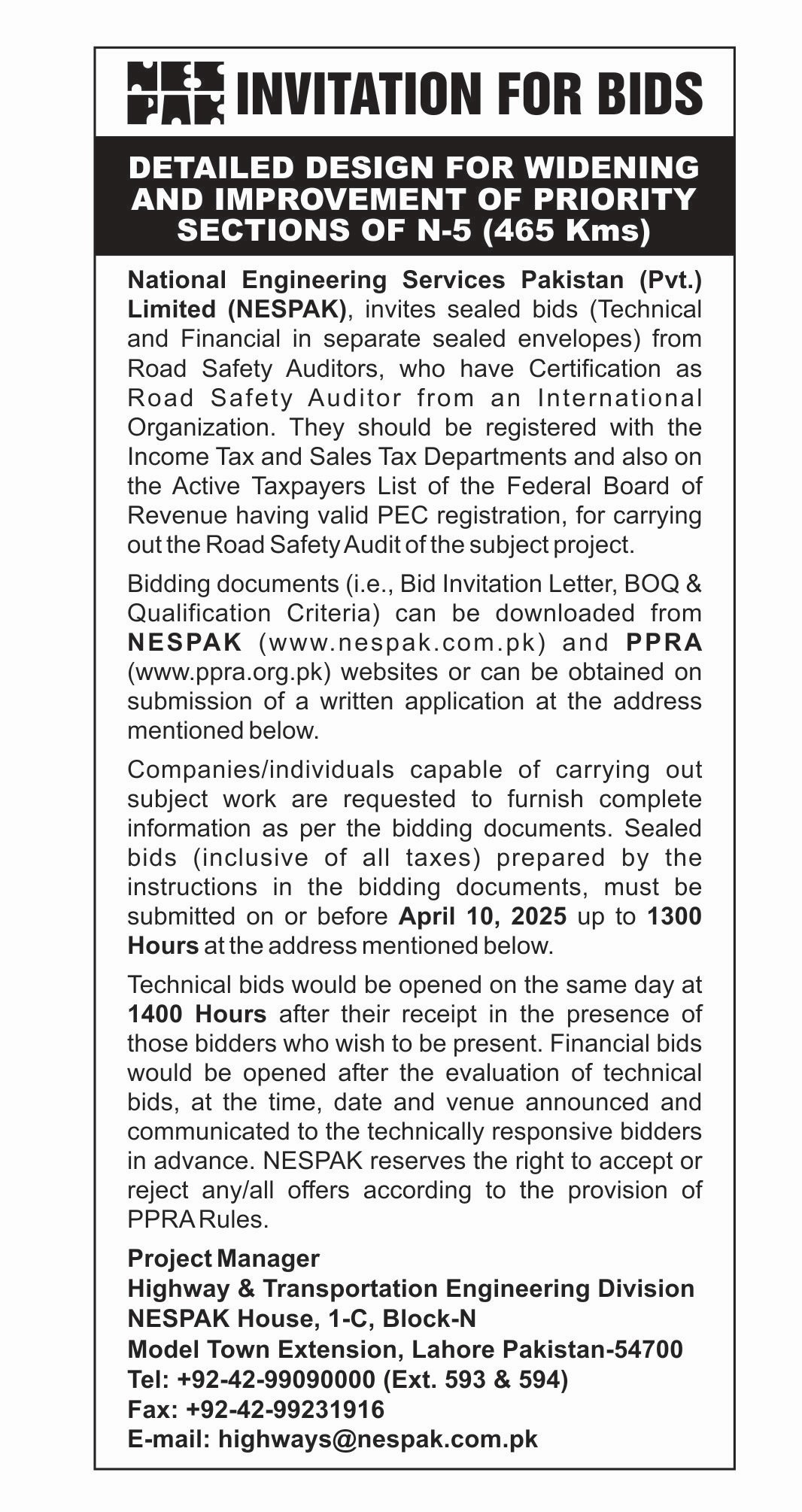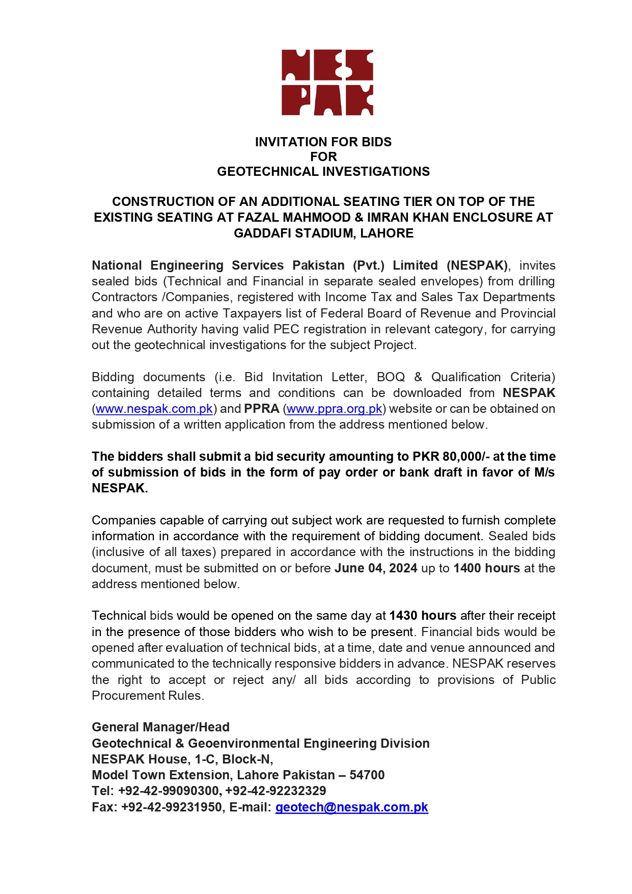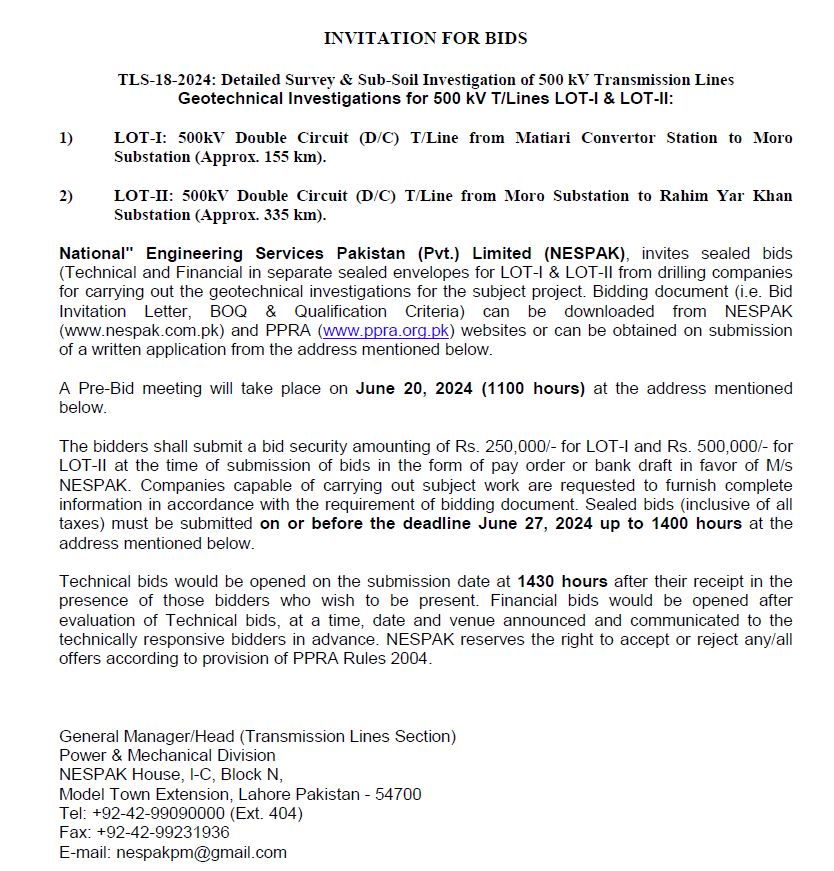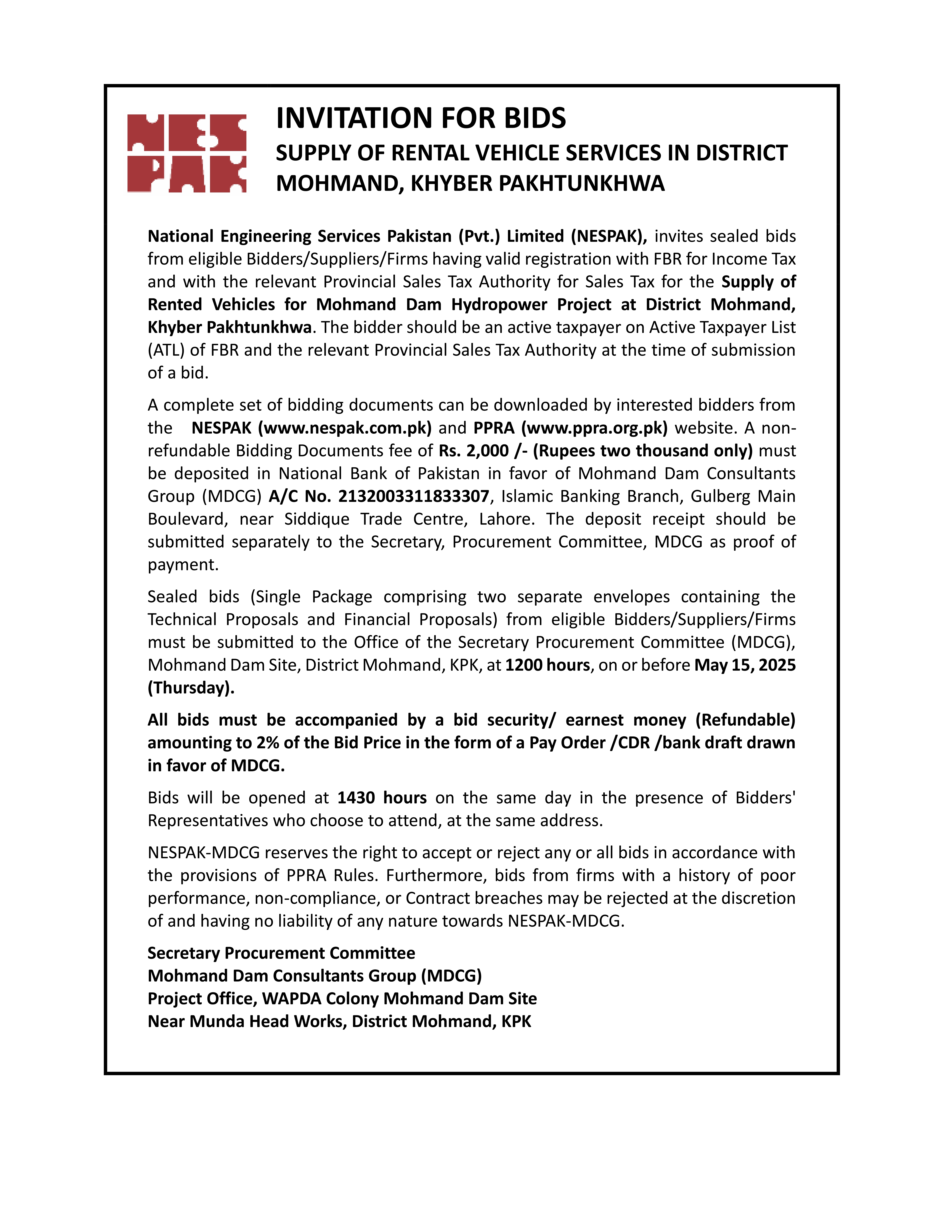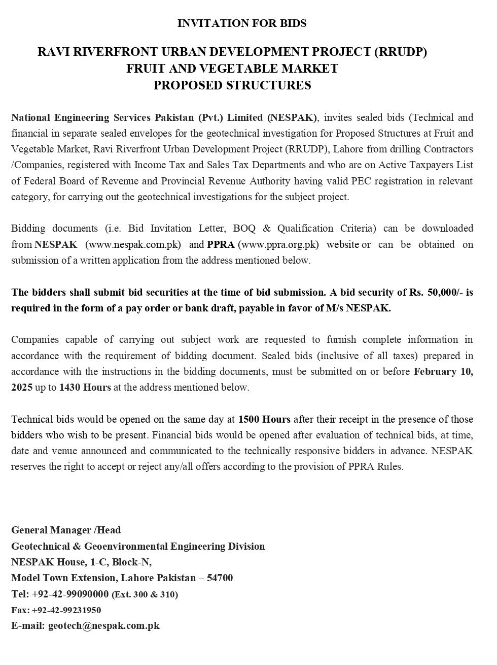 INVITATION FOR BIDS -ENLISTMENT OF PHARMACIES ON NESPAK PANEL IN LAHORE
