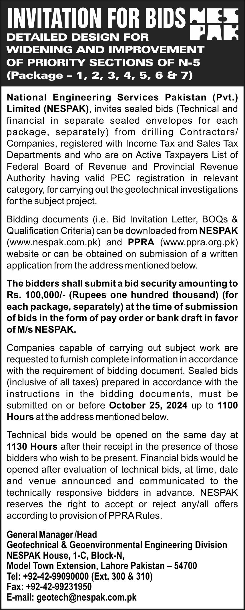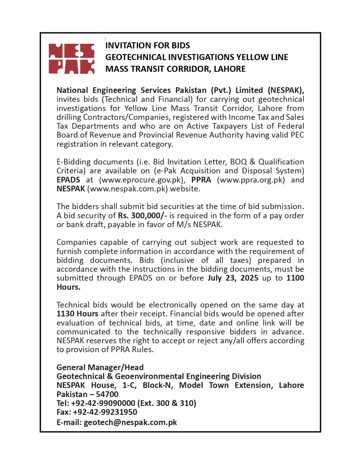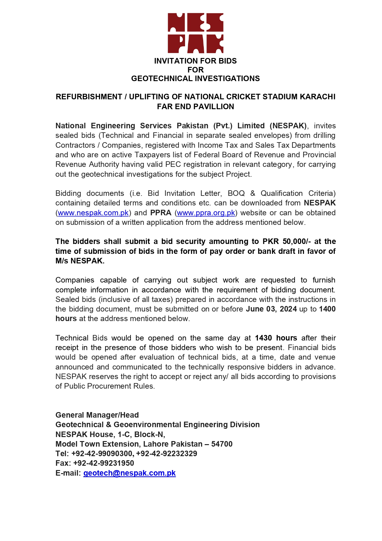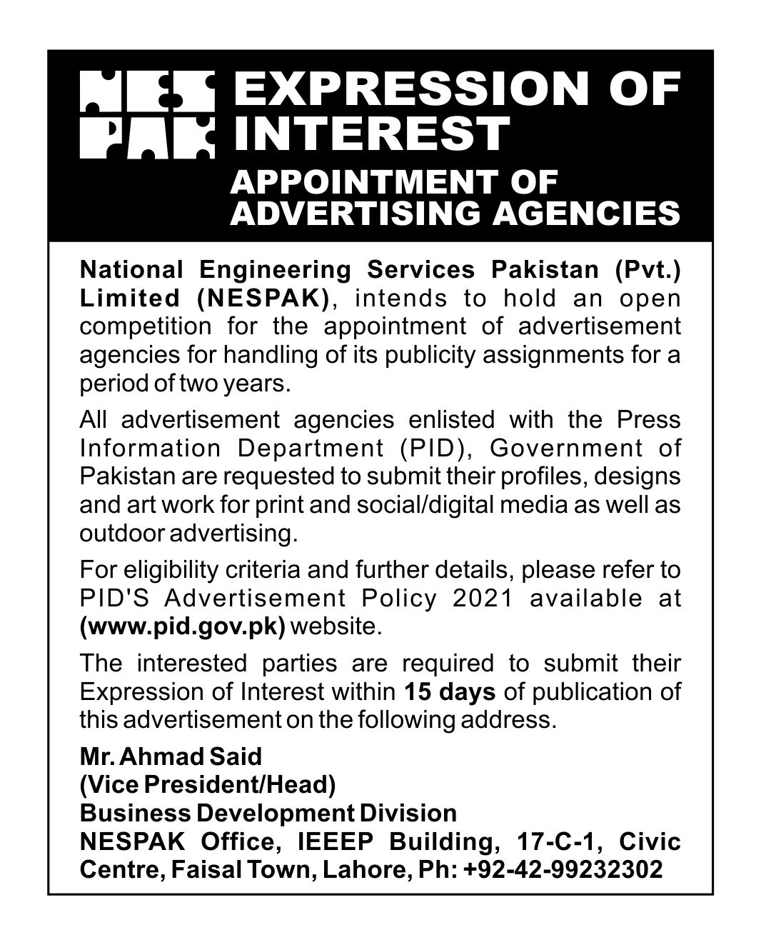 INVITATION FOR BIDS -ENLISTMENT OF PHARMACIES ON NESPAK PANEL IN LAHORE