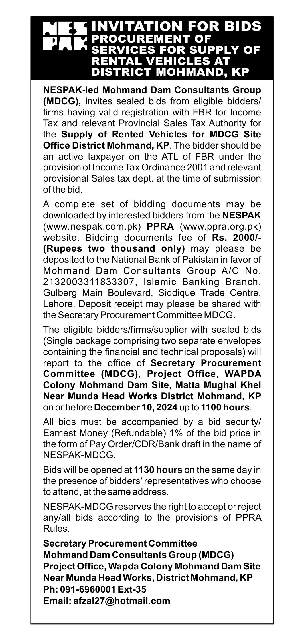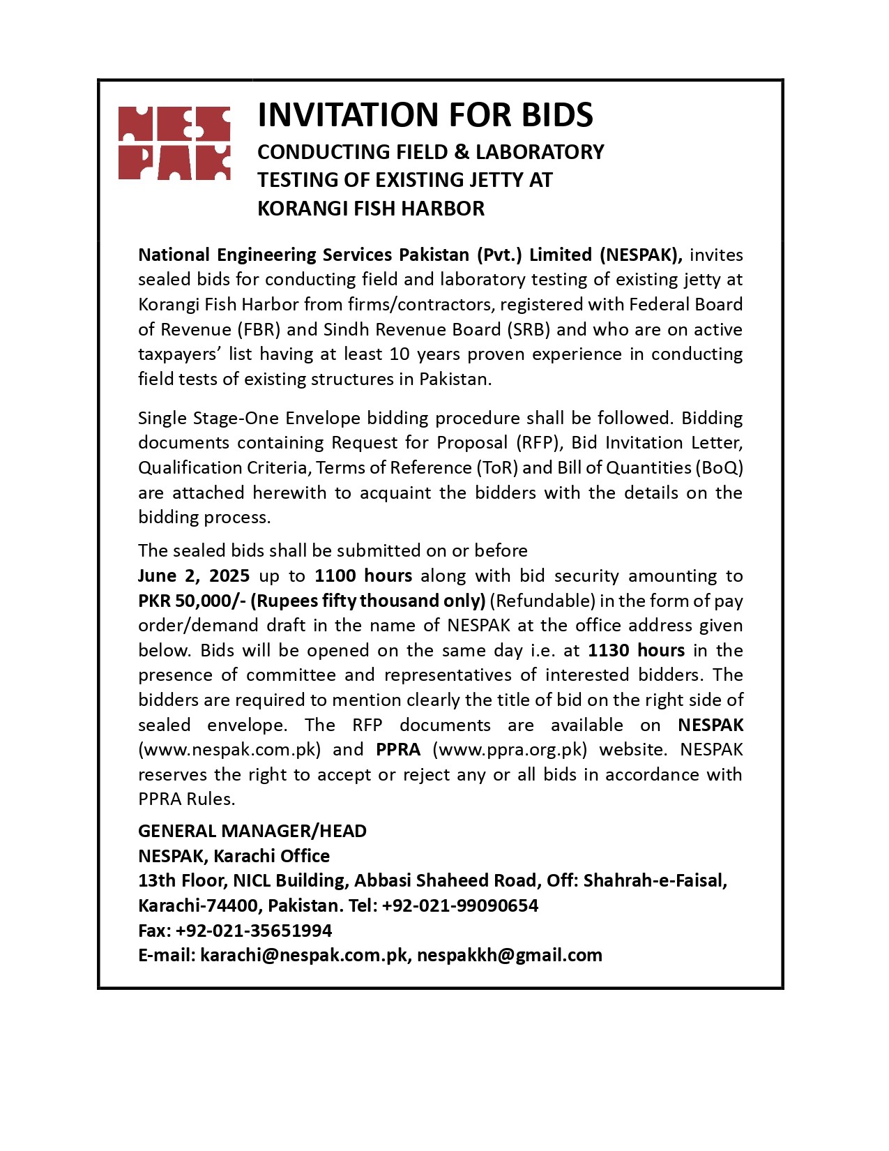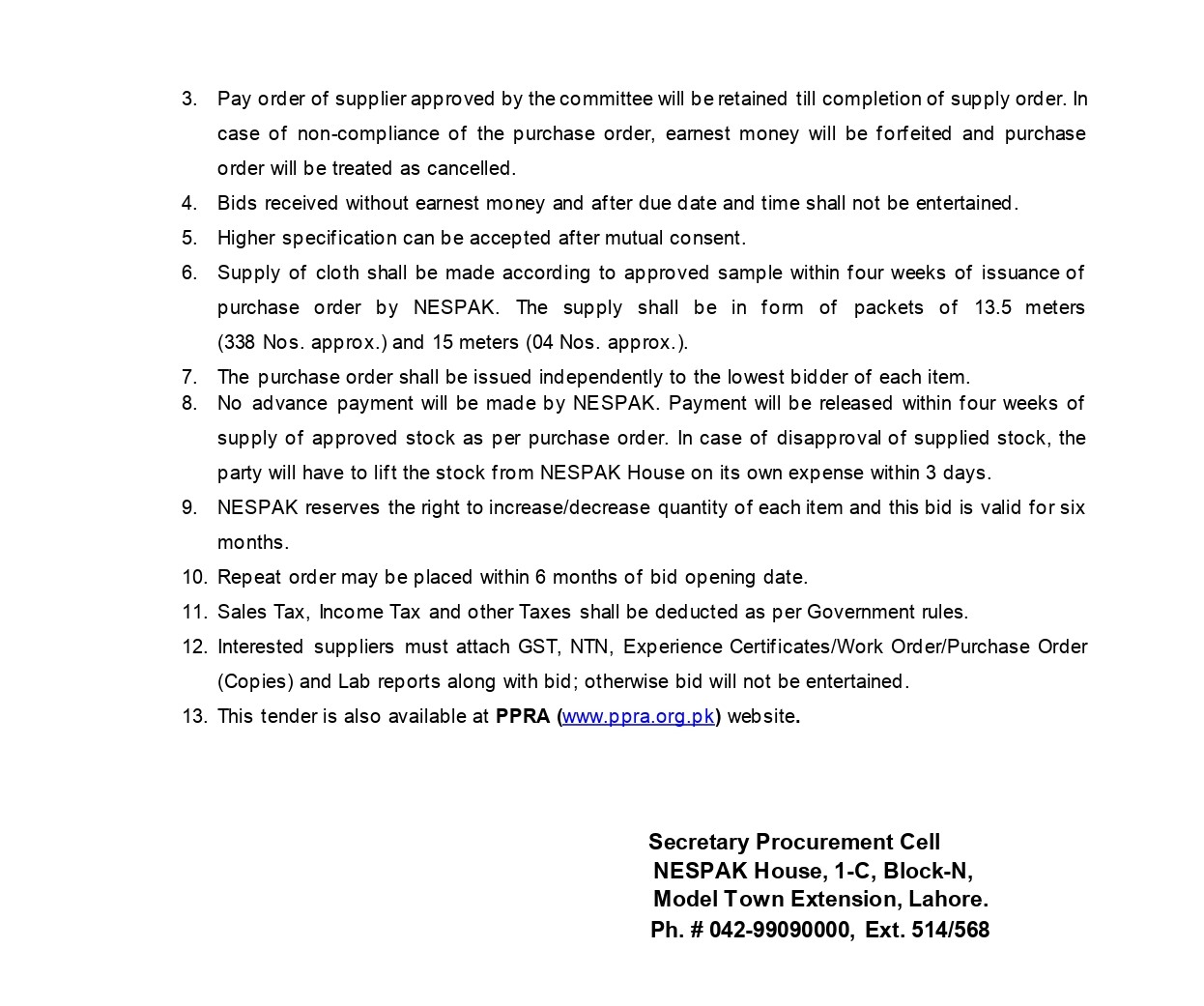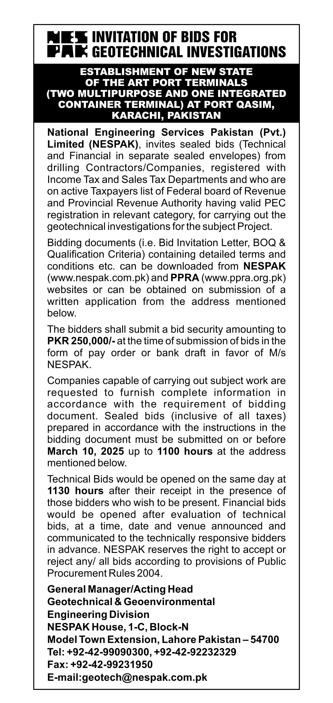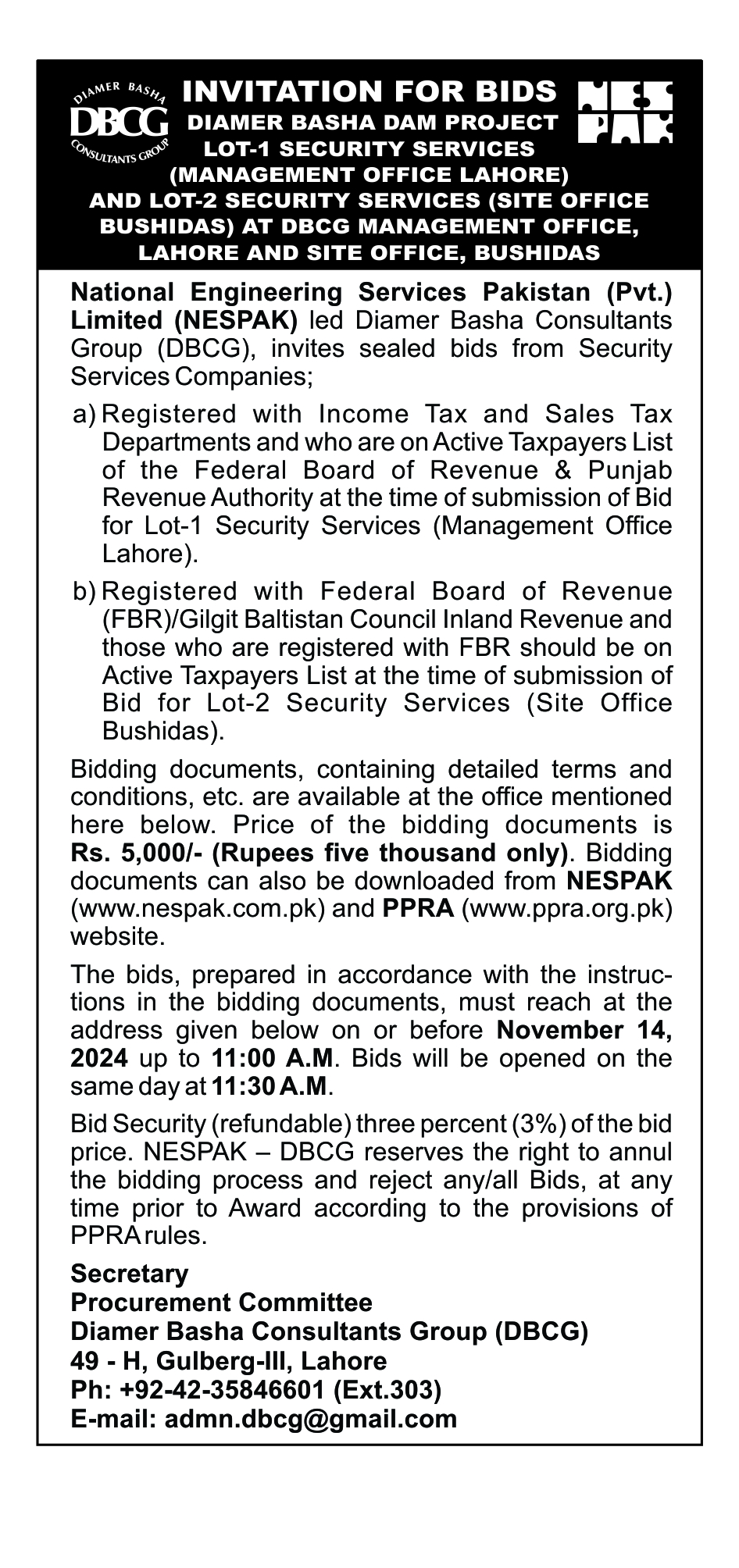 INVITATION FOR BIDS -ENLISTMENT OF PHARMACIES ON NESPAK PANEL IN LAHORE