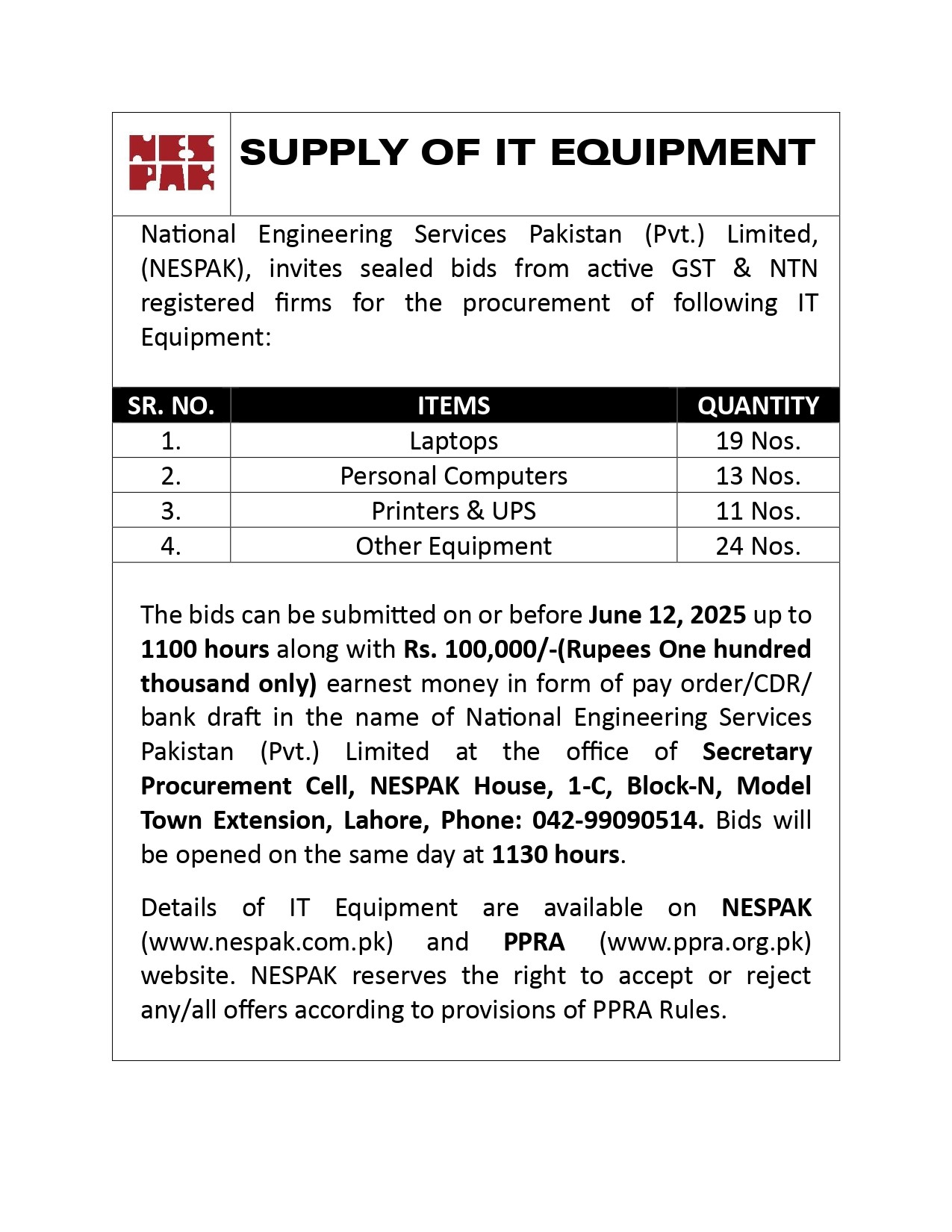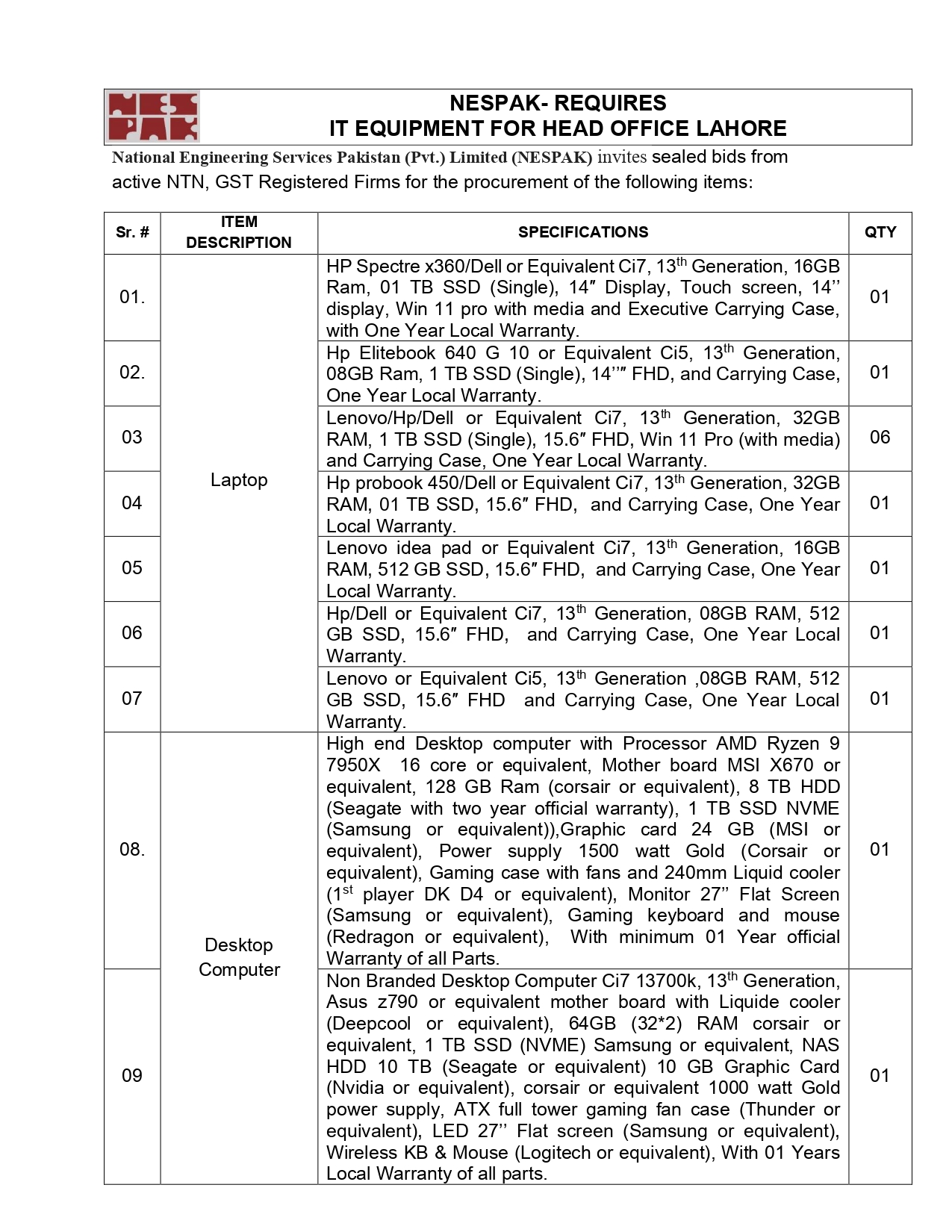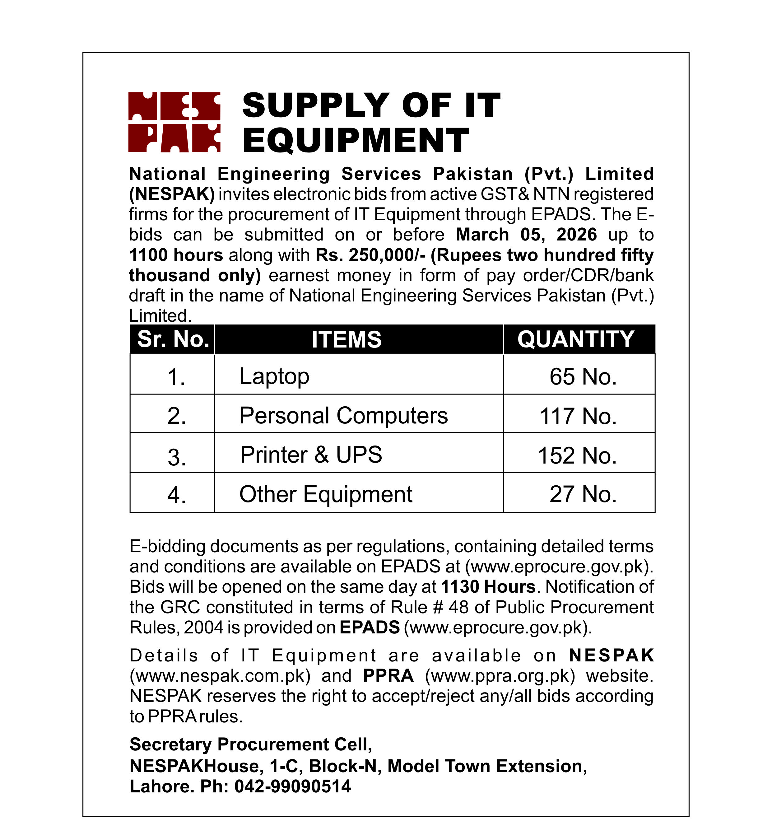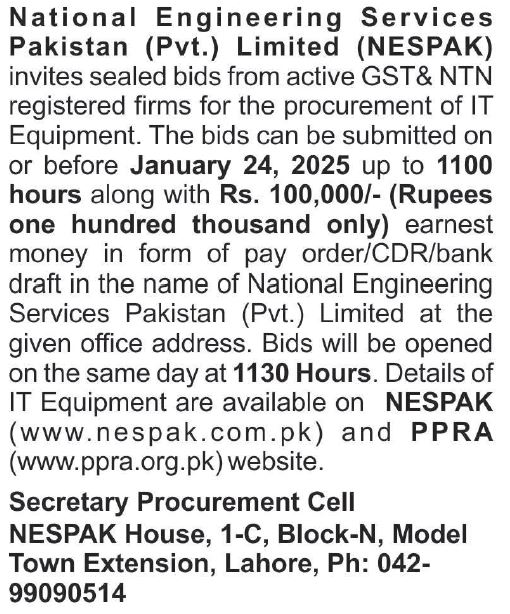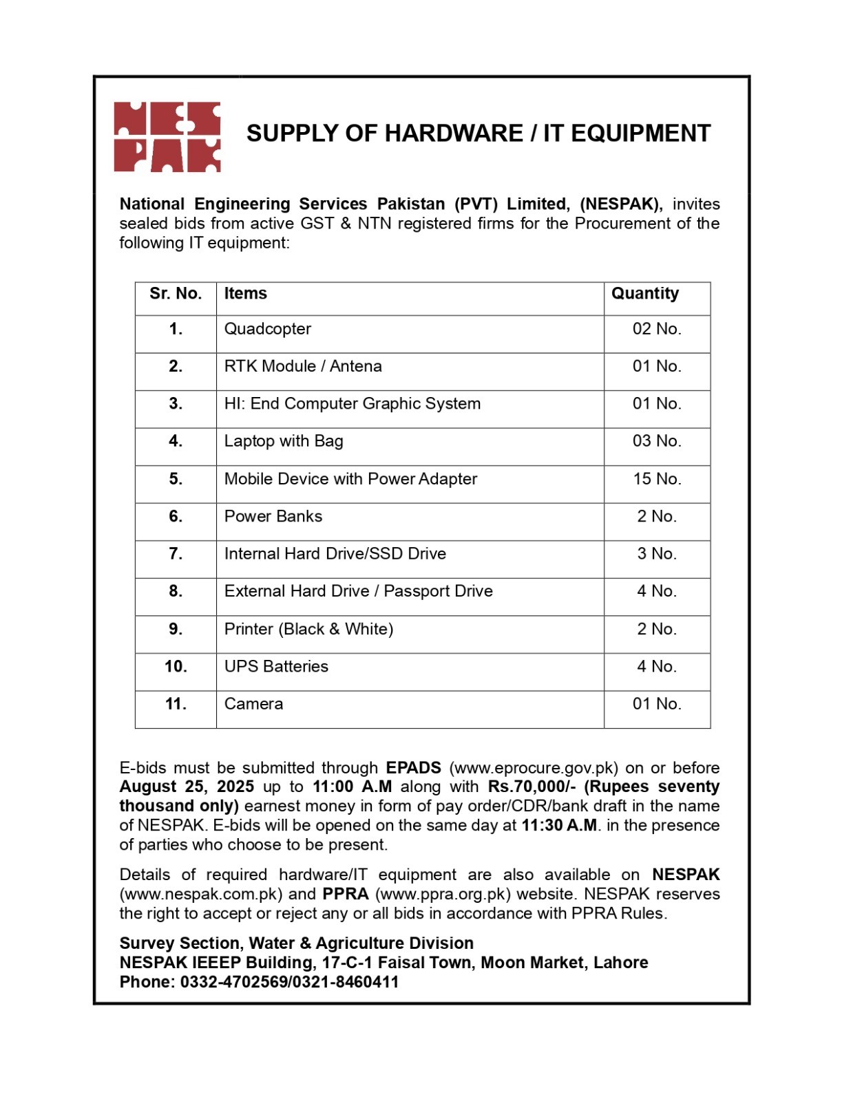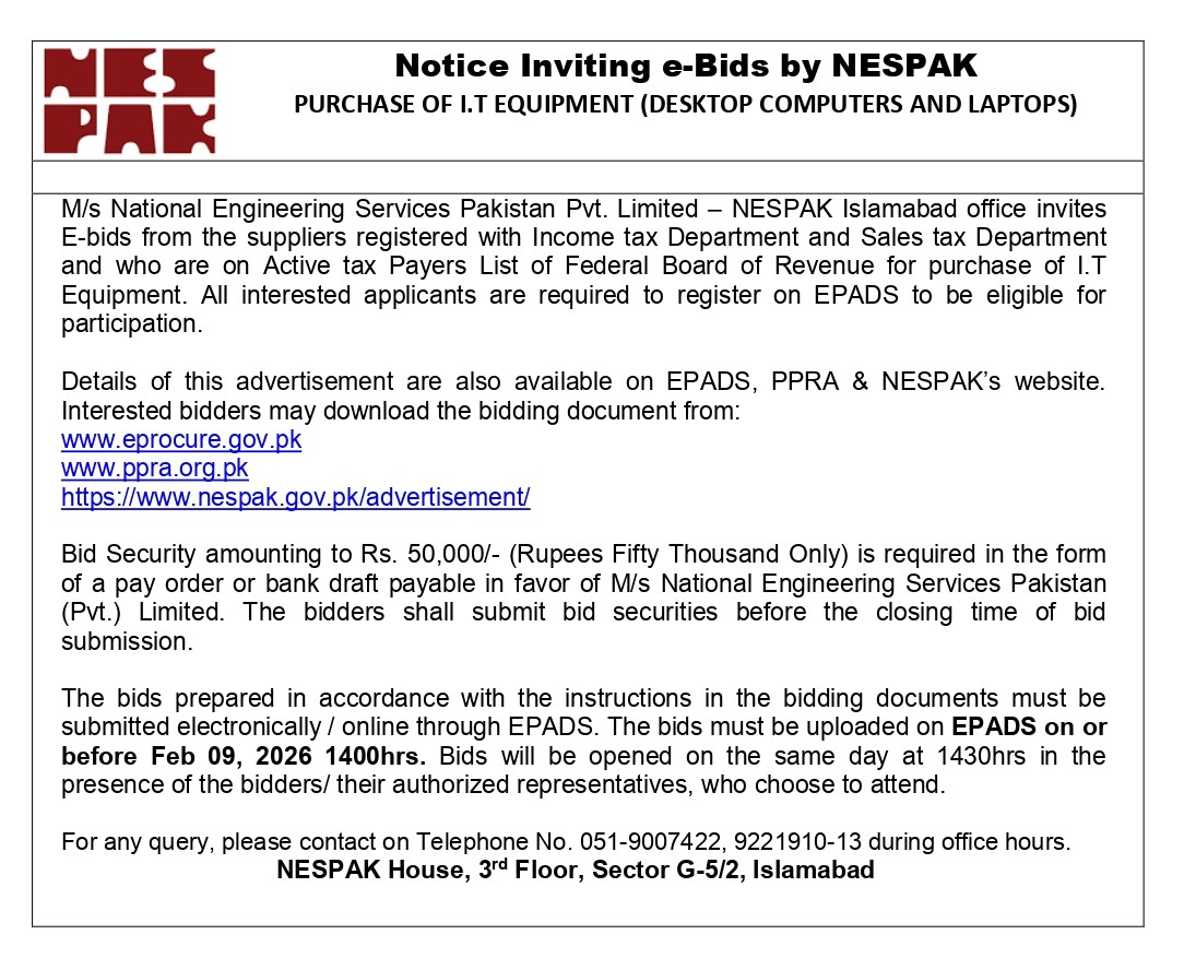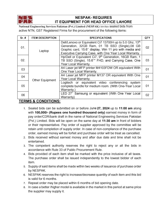 NESPAK- REQUIRES IT EQUIPMENT FOR WATER AND AGRICULTURE DIVISION LAHORE