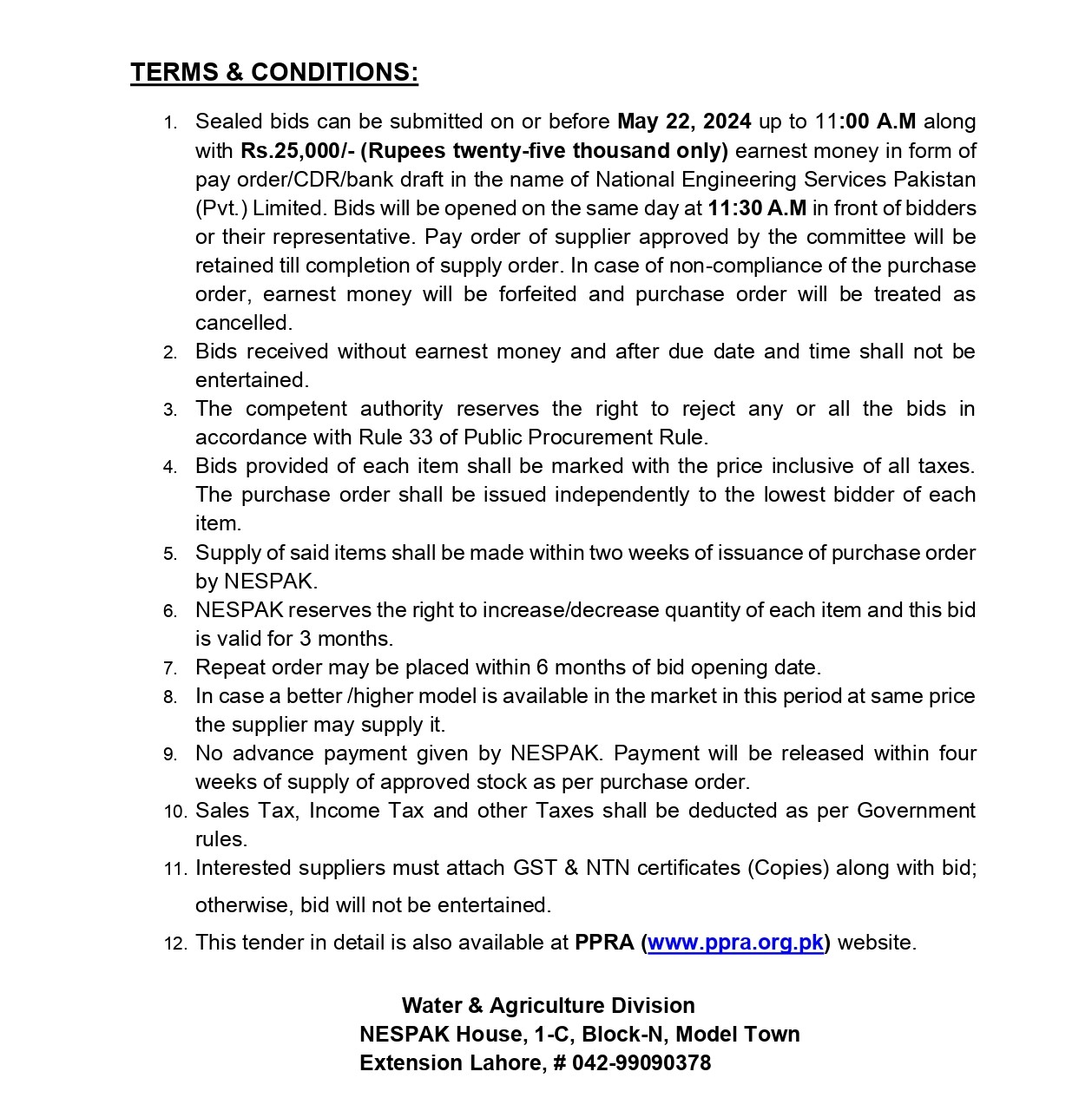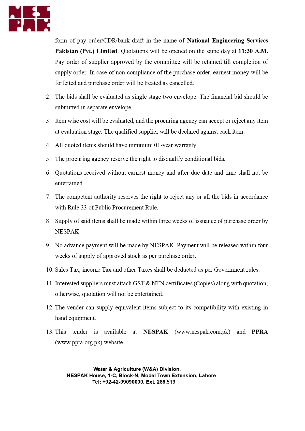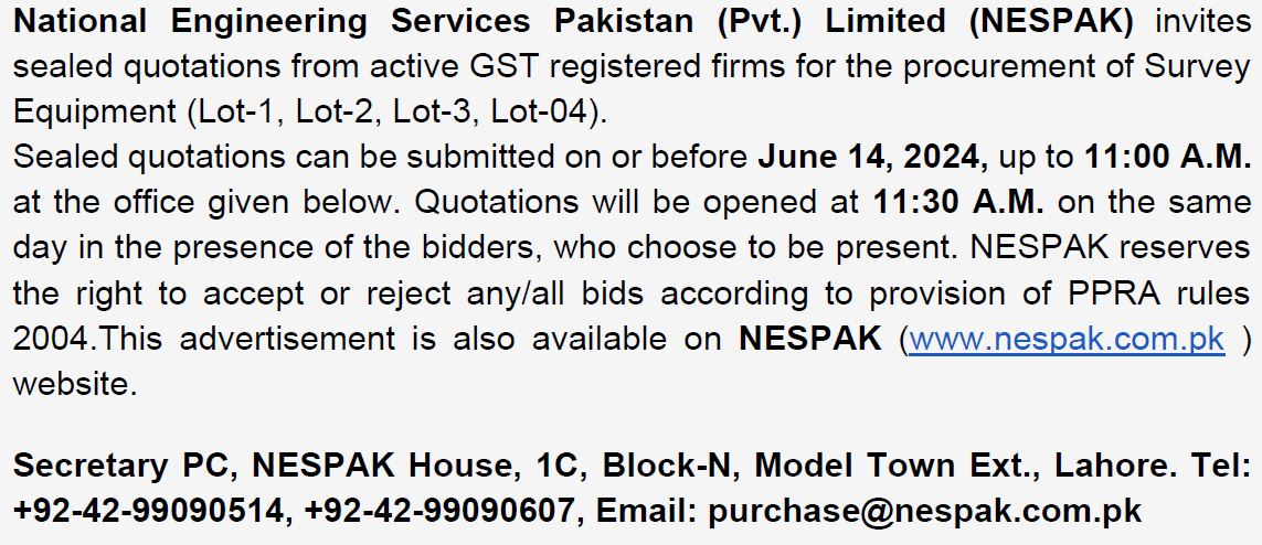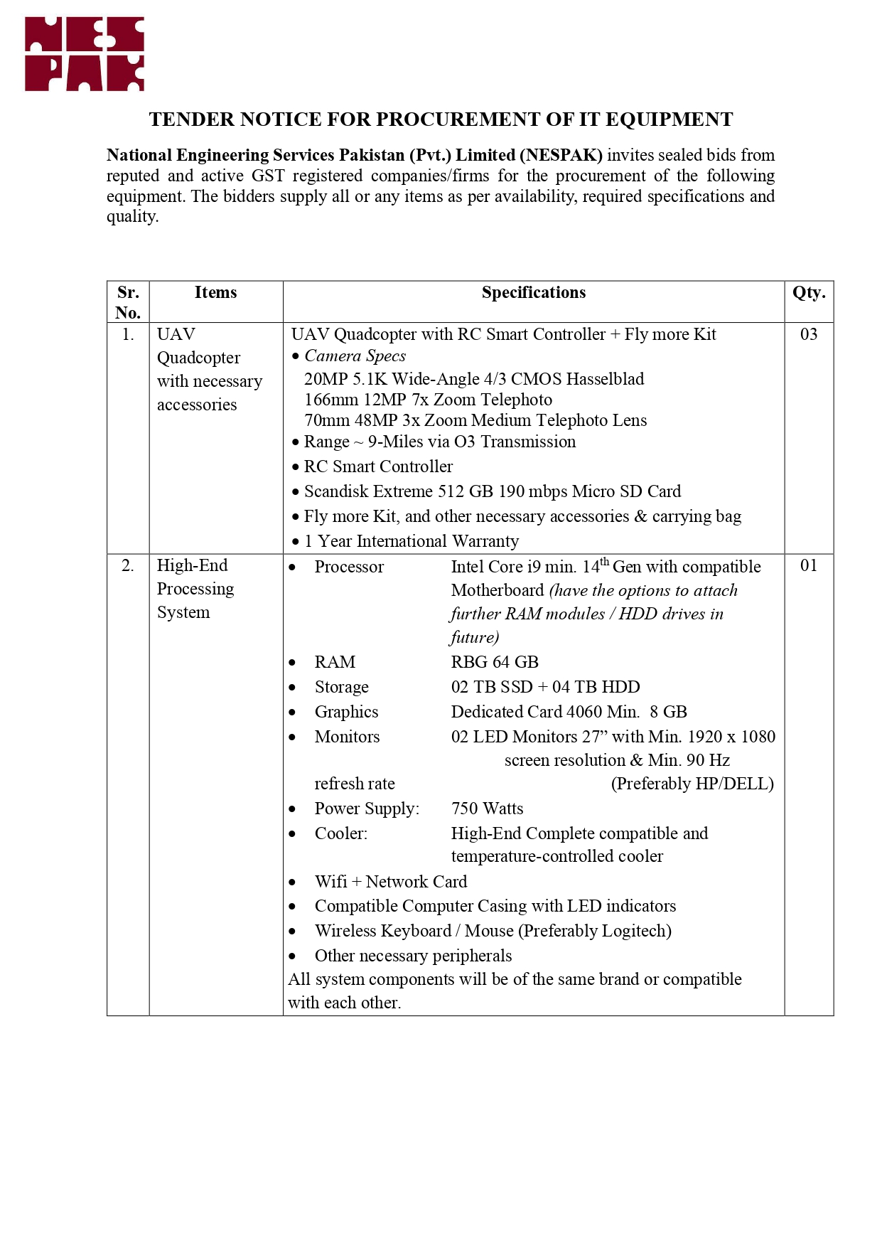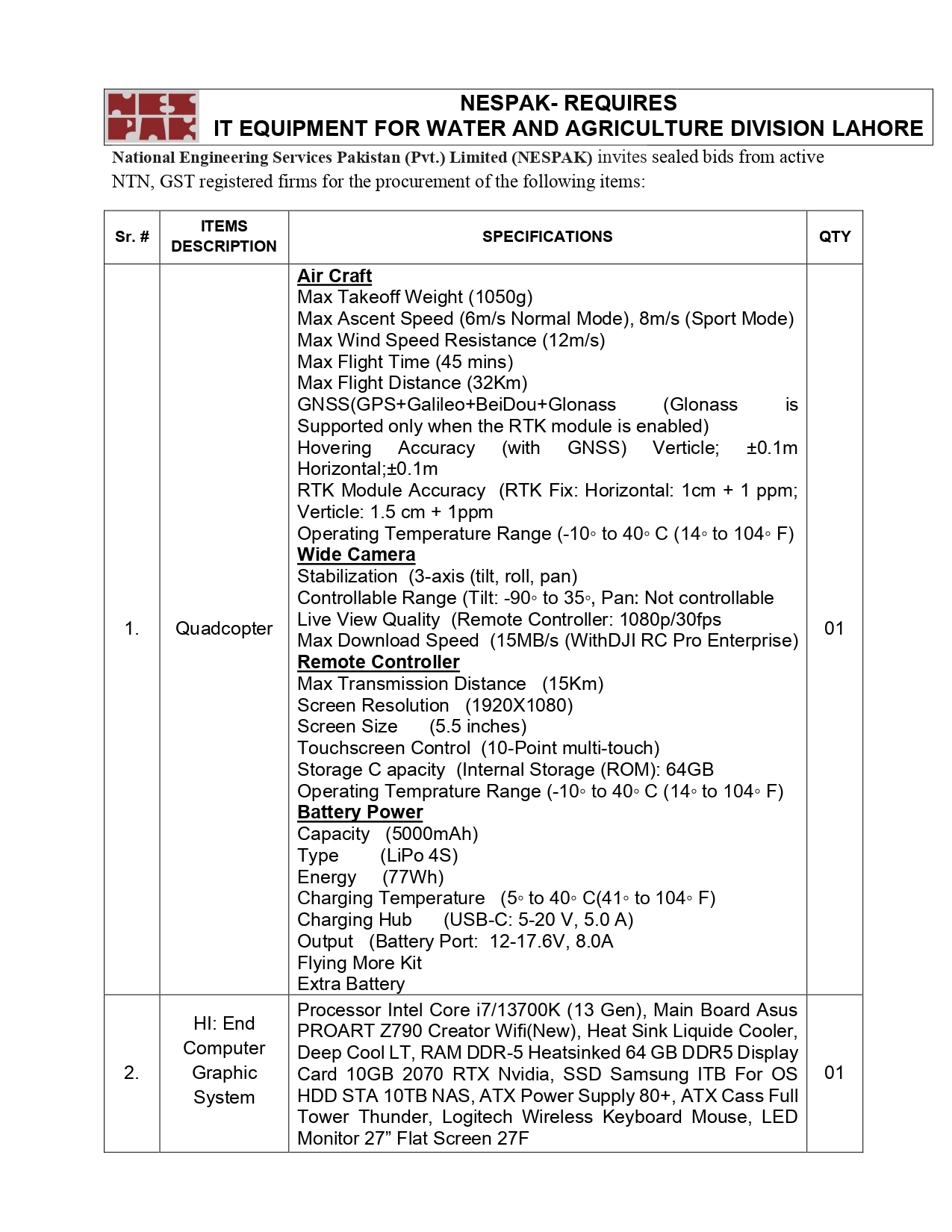 NESPAK- REQUIRES IT EQUIPMENT FOR WATER AND AGRICULTURE DIVISION LAHORE
