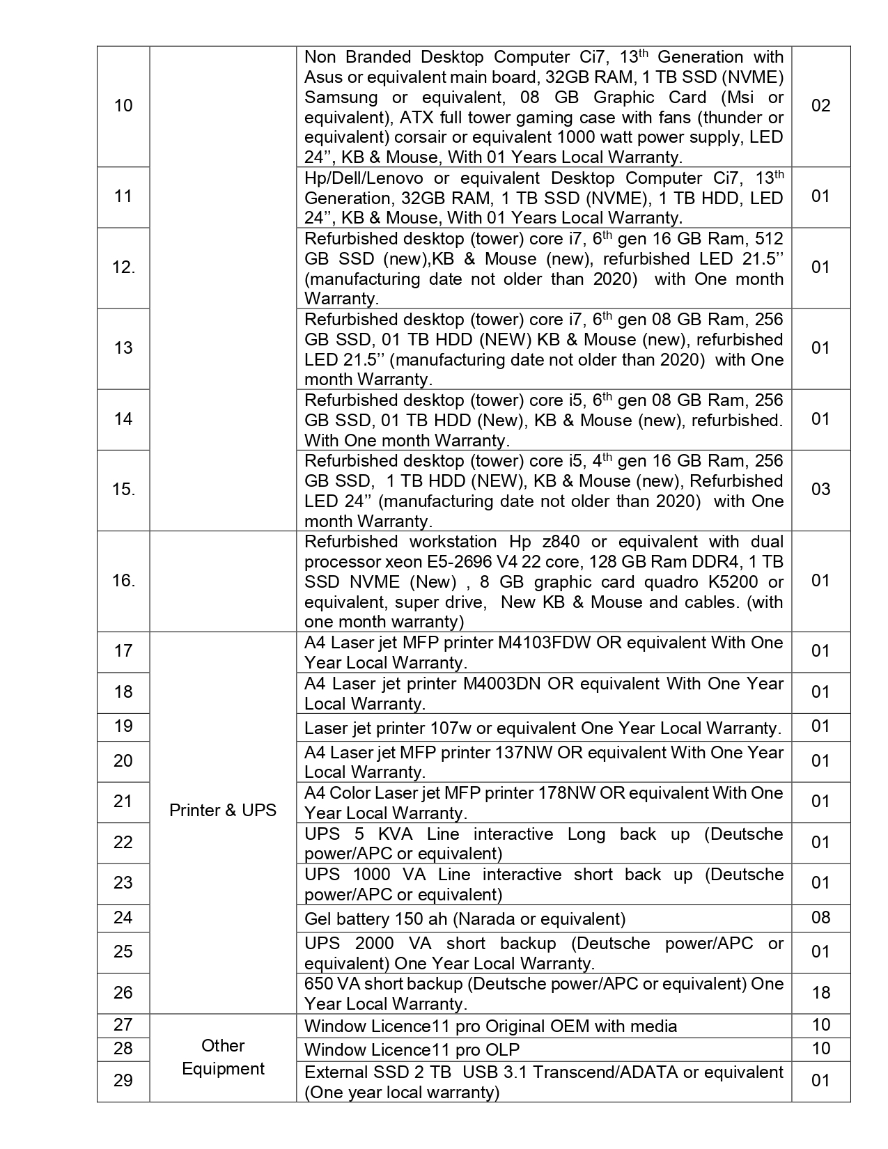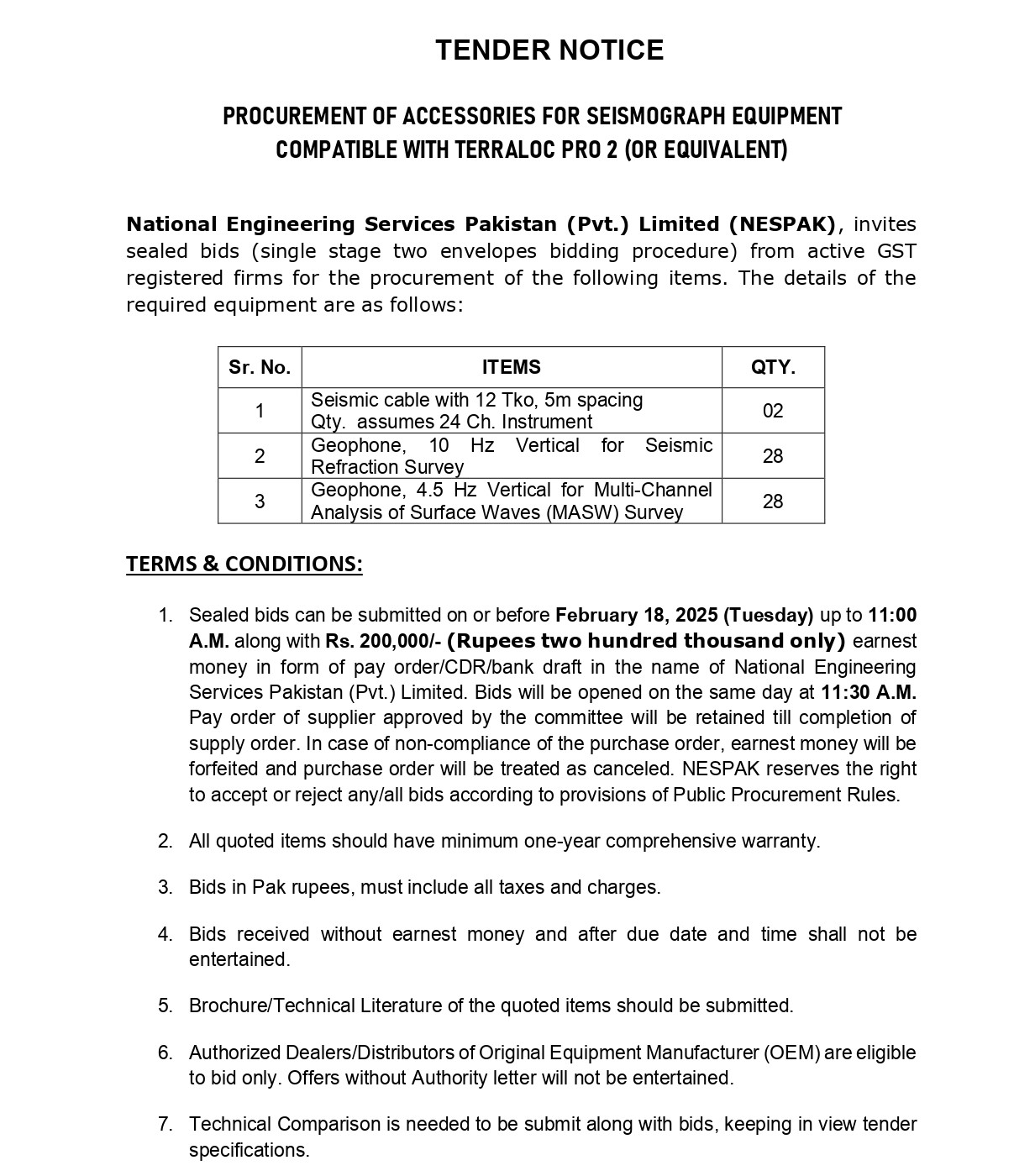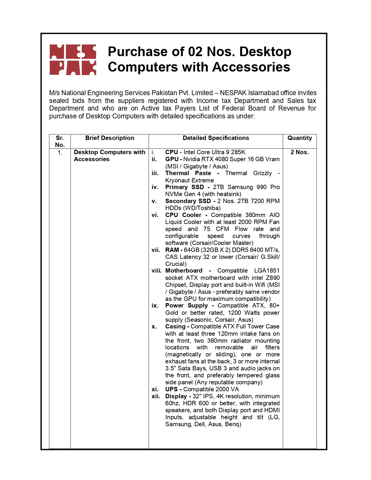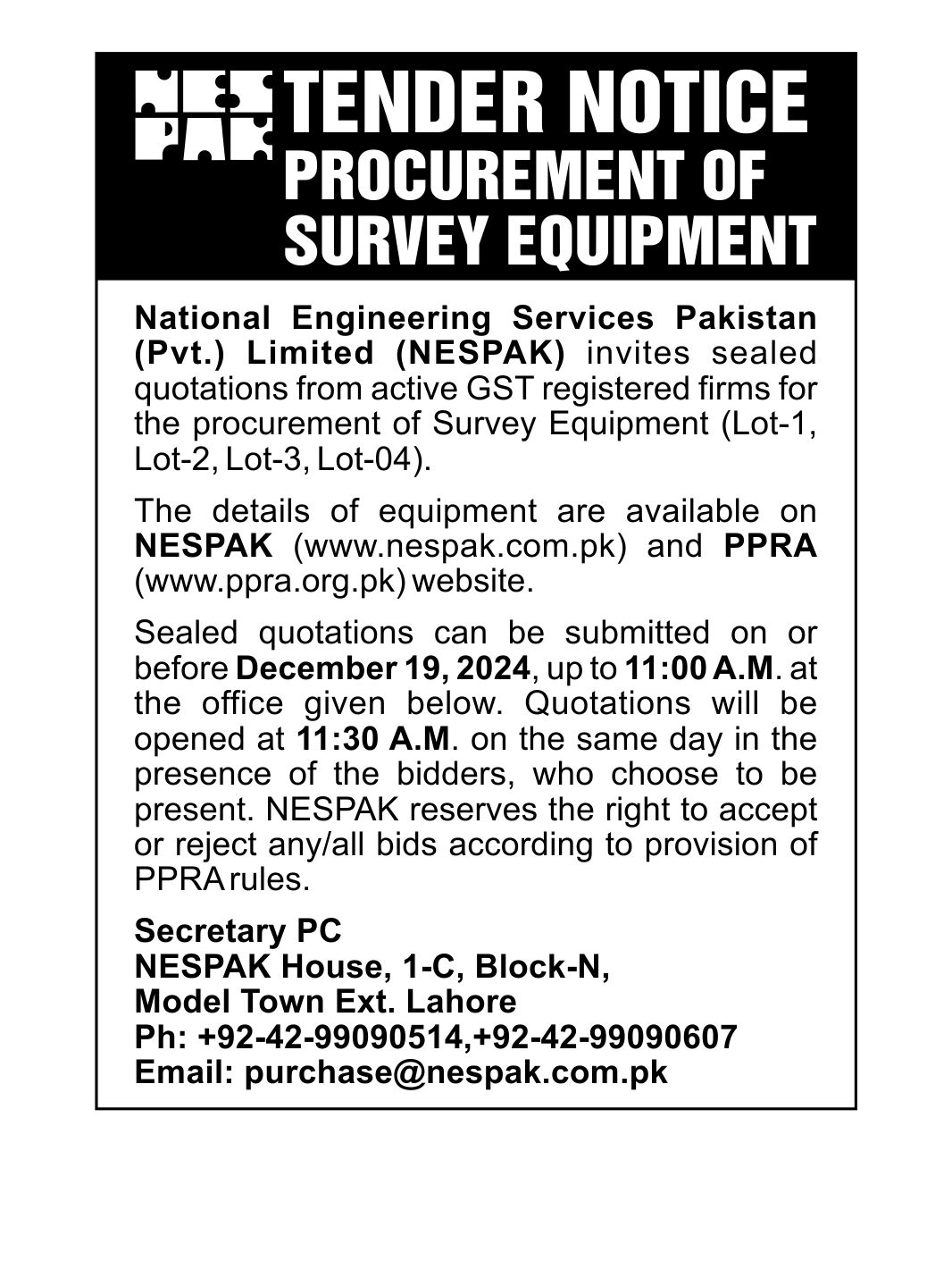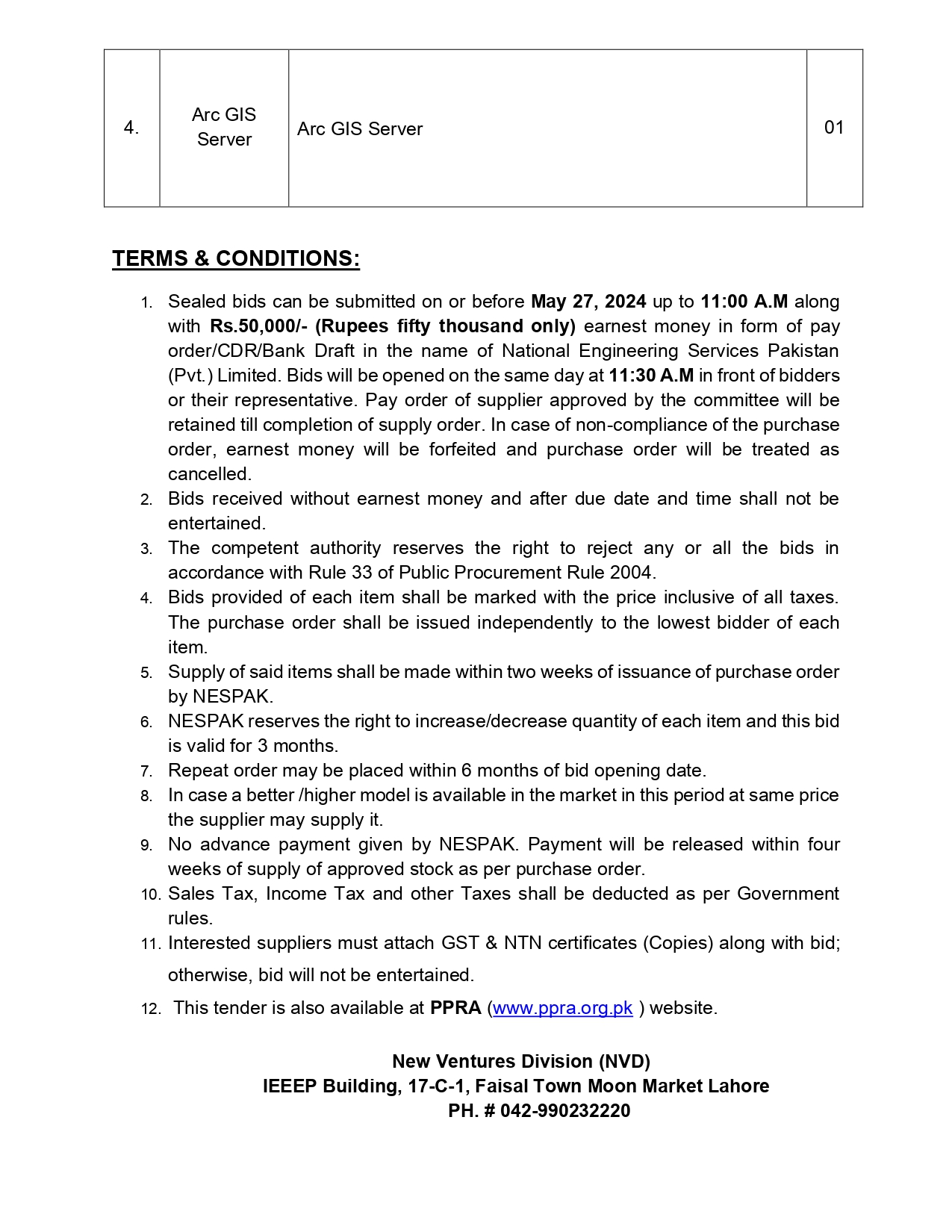 NESPAK- REQUIRES IT EQUIPMENT FOR WATER AND AGRICULTURE DIVISION LAHORE