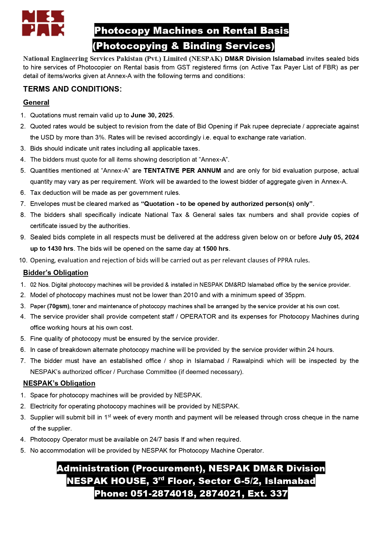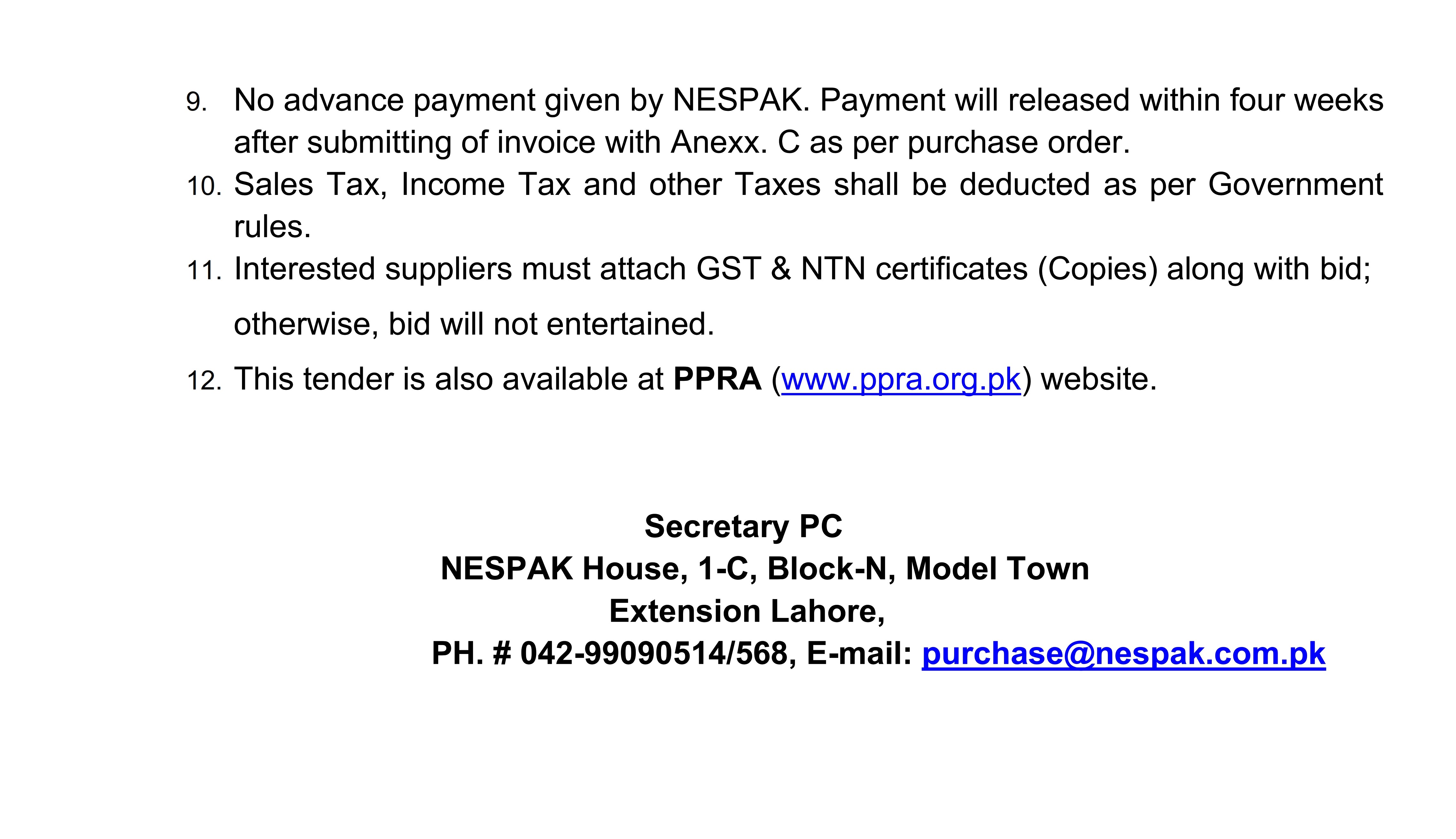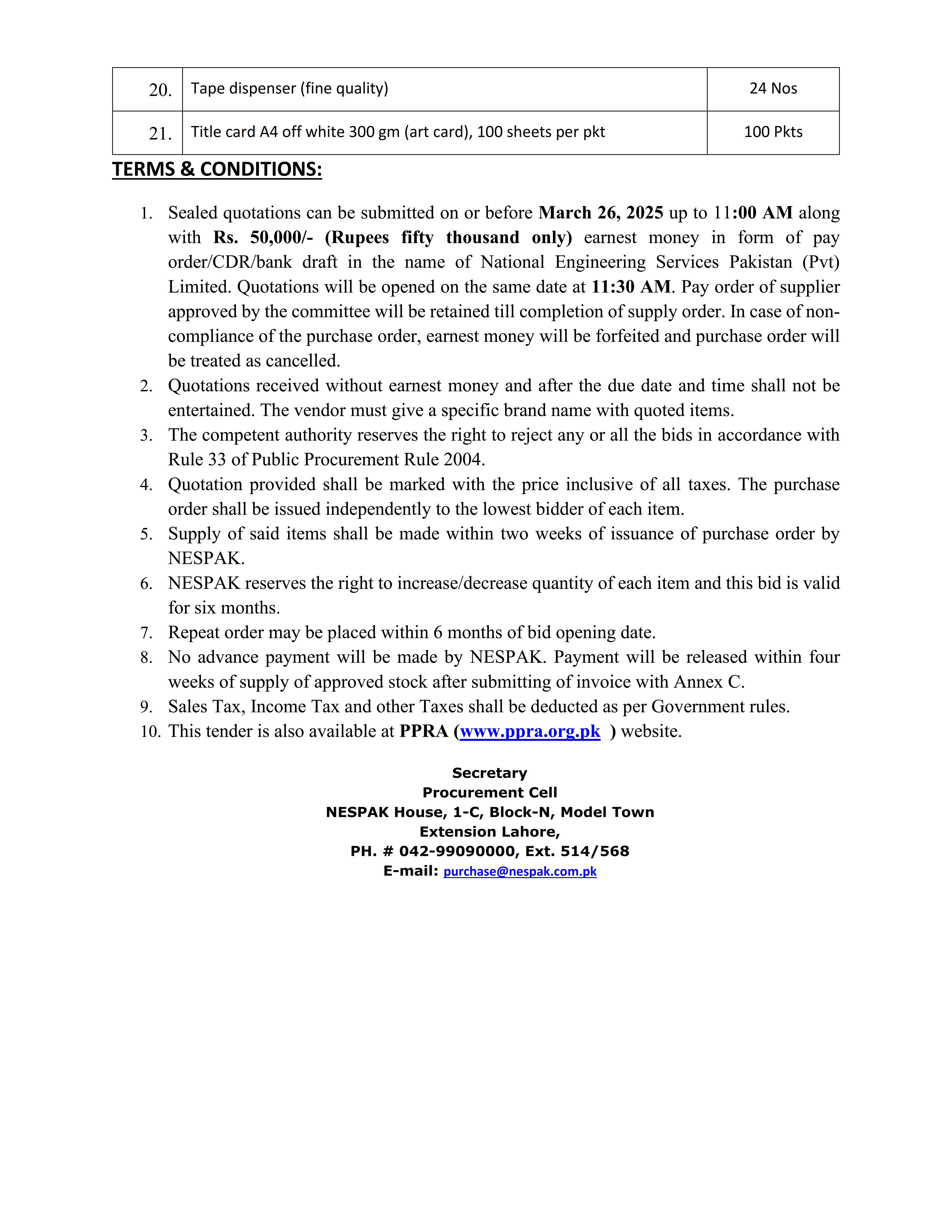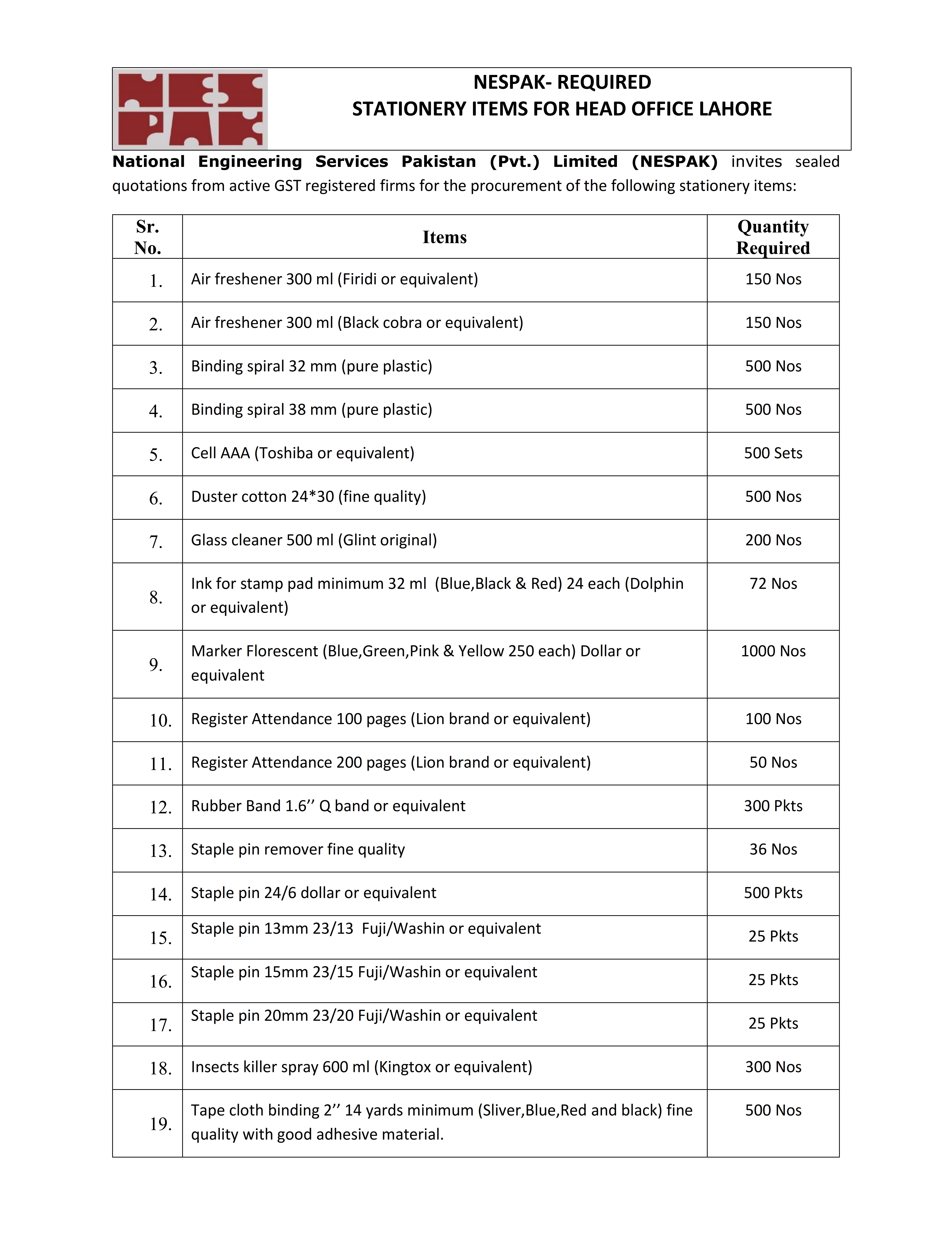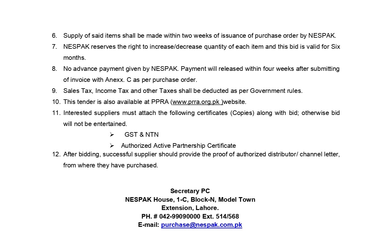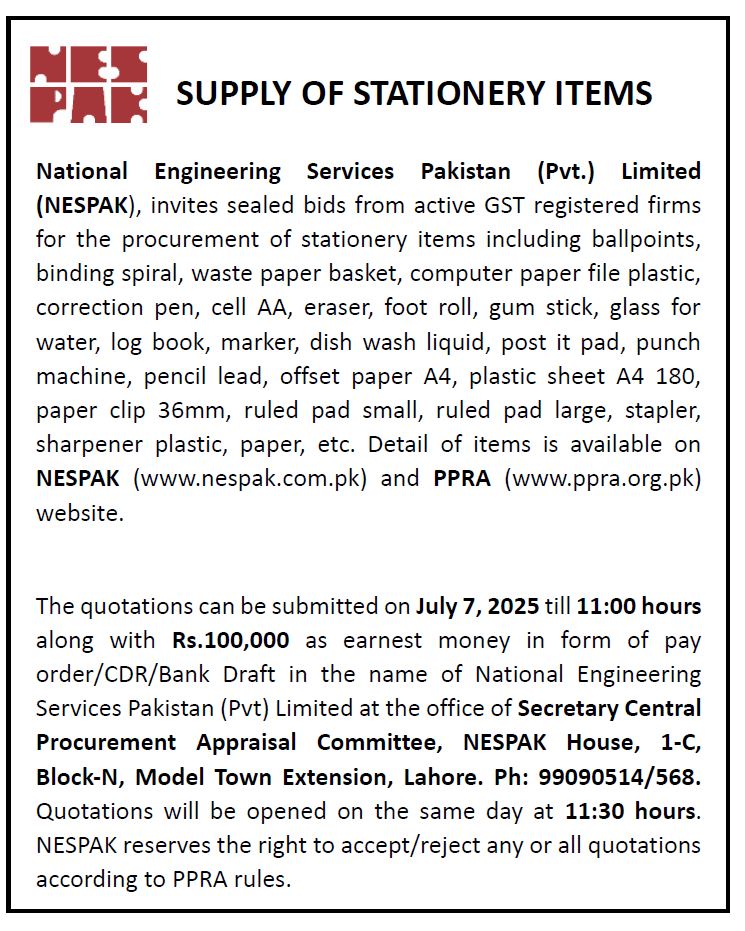 HIRING OF STATIONERY SUPPLIER FOR NESPAK HOUSE, ISLAMABAD