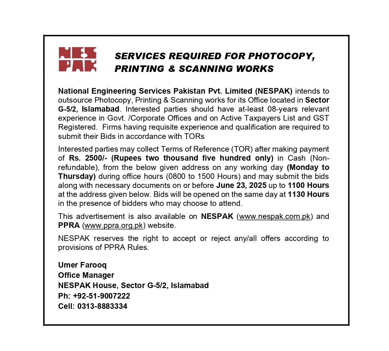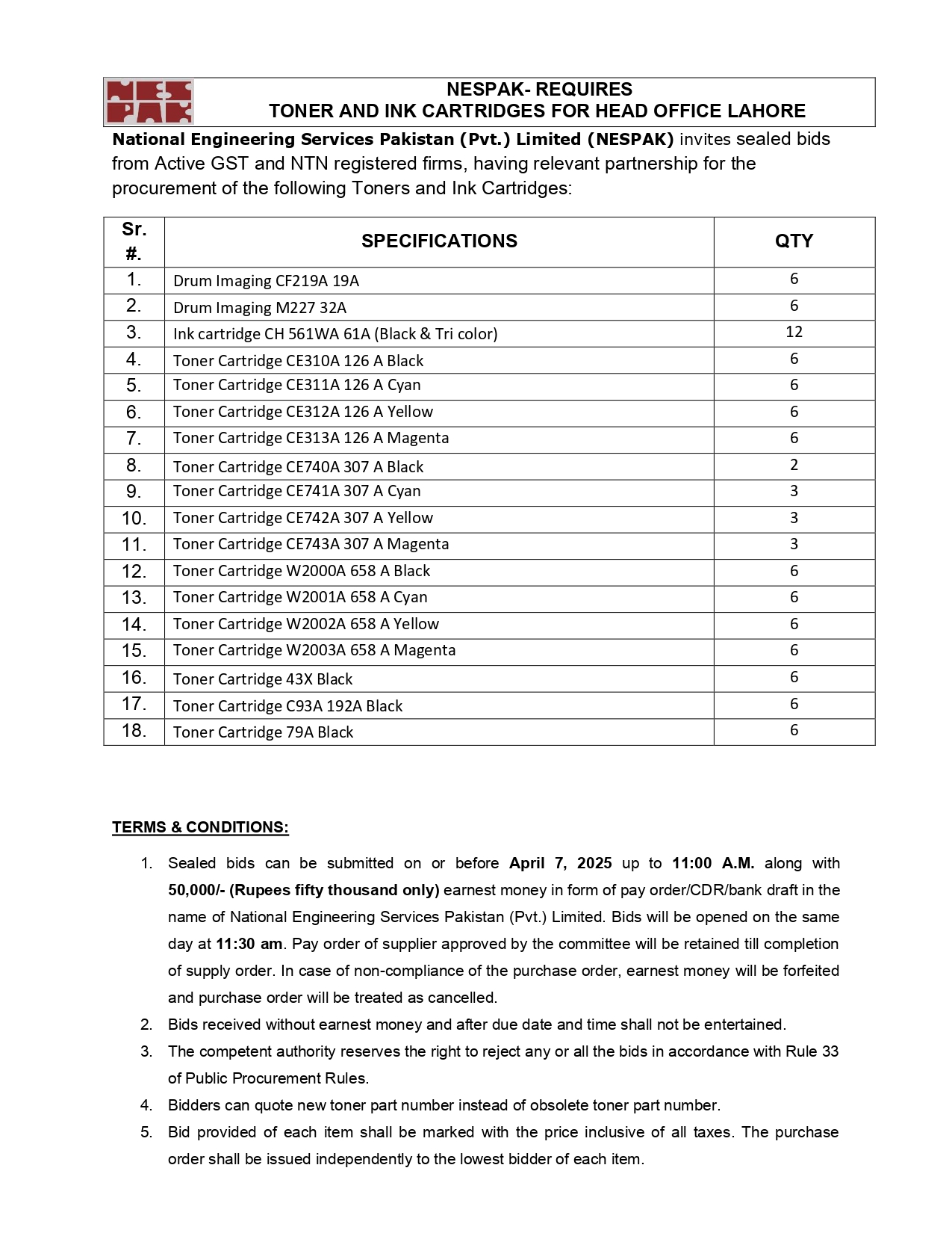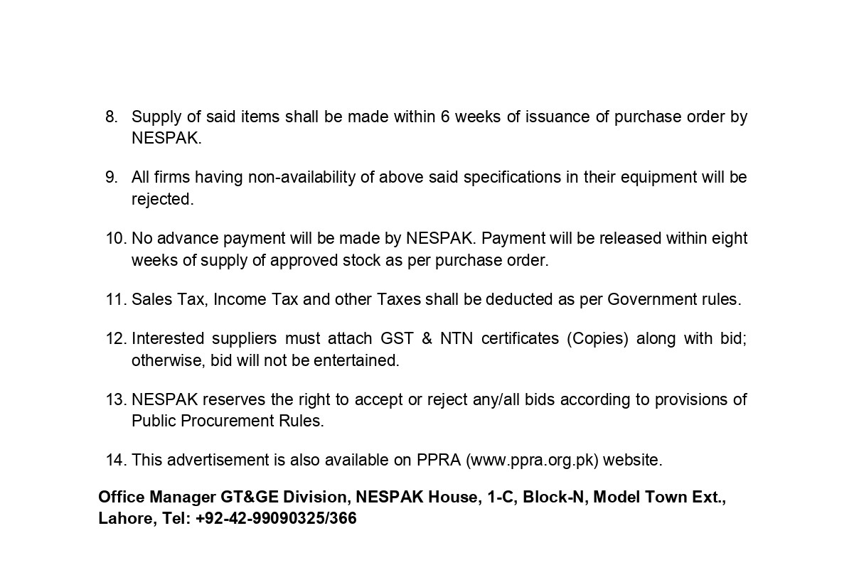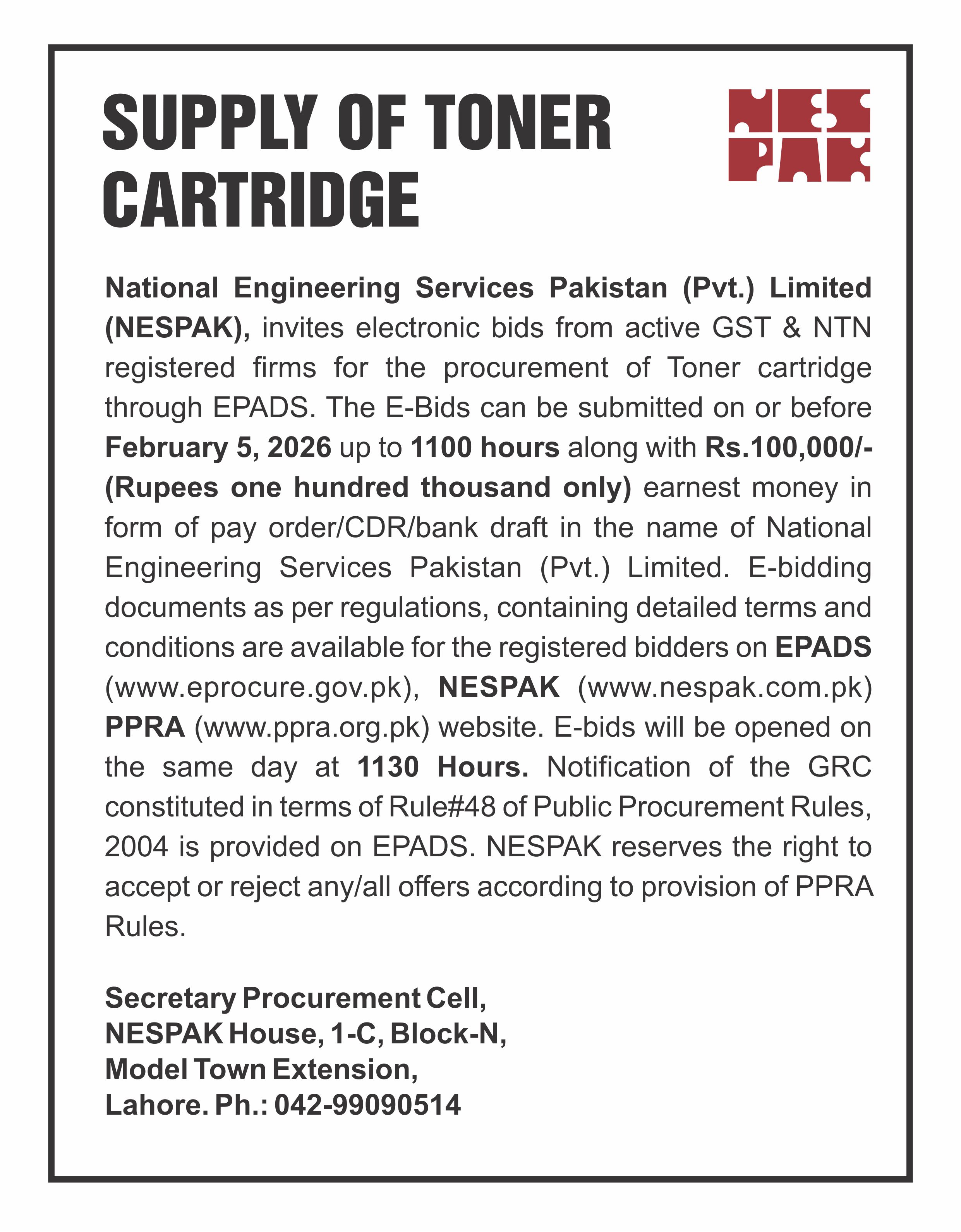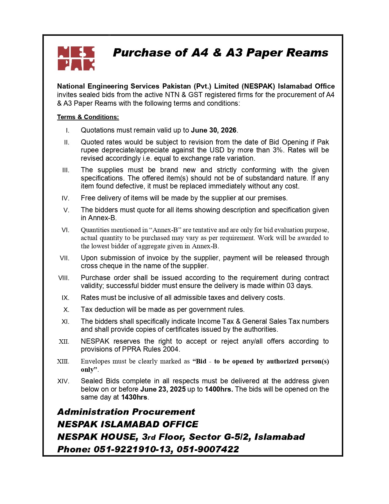 HIRING OF STATIONERY SUPPLIER FOR NESPAK HOUSE, ISLAMABAD