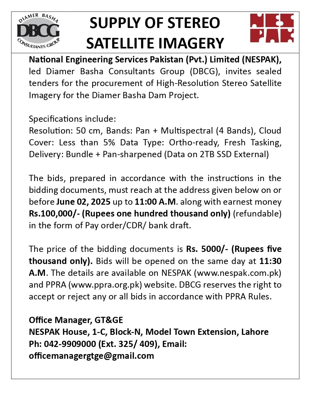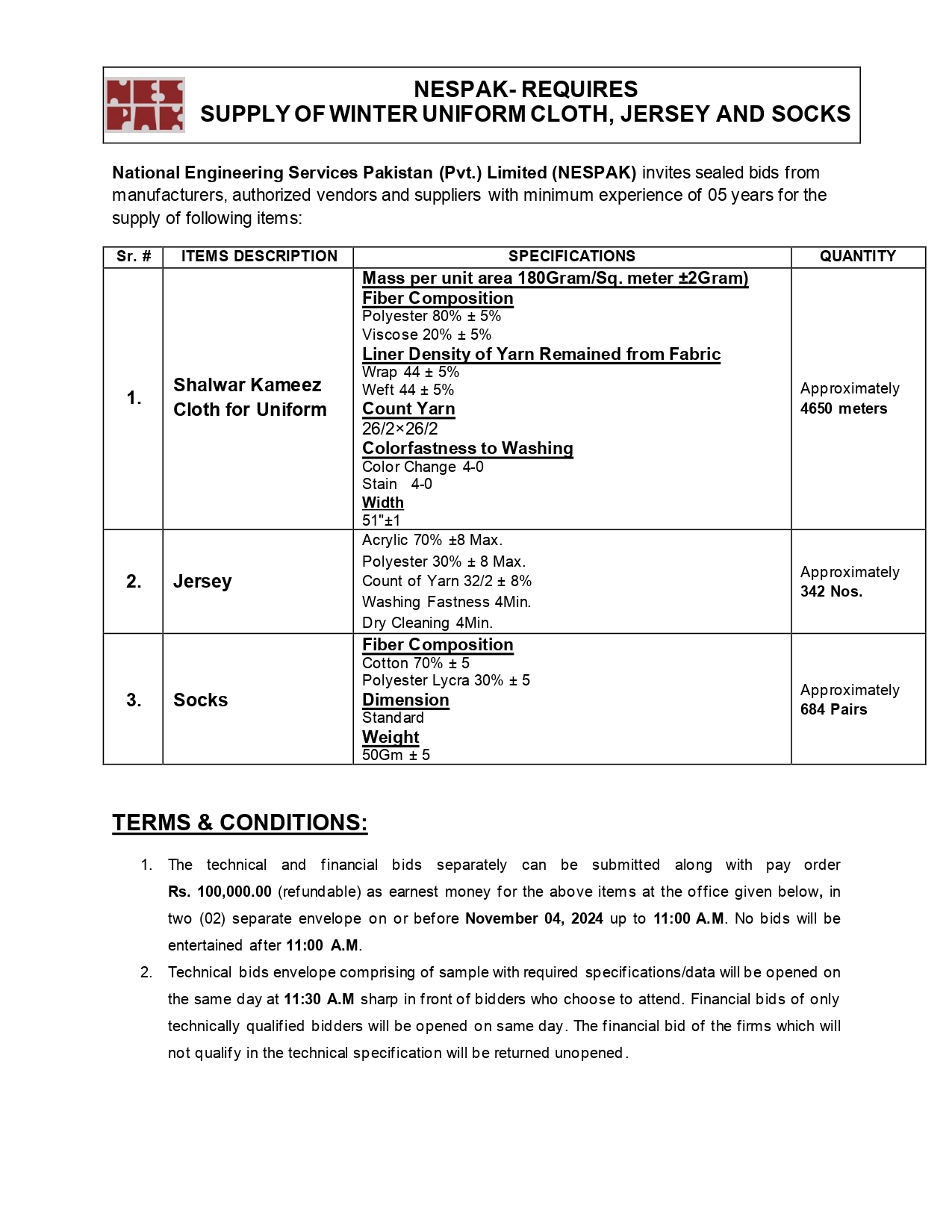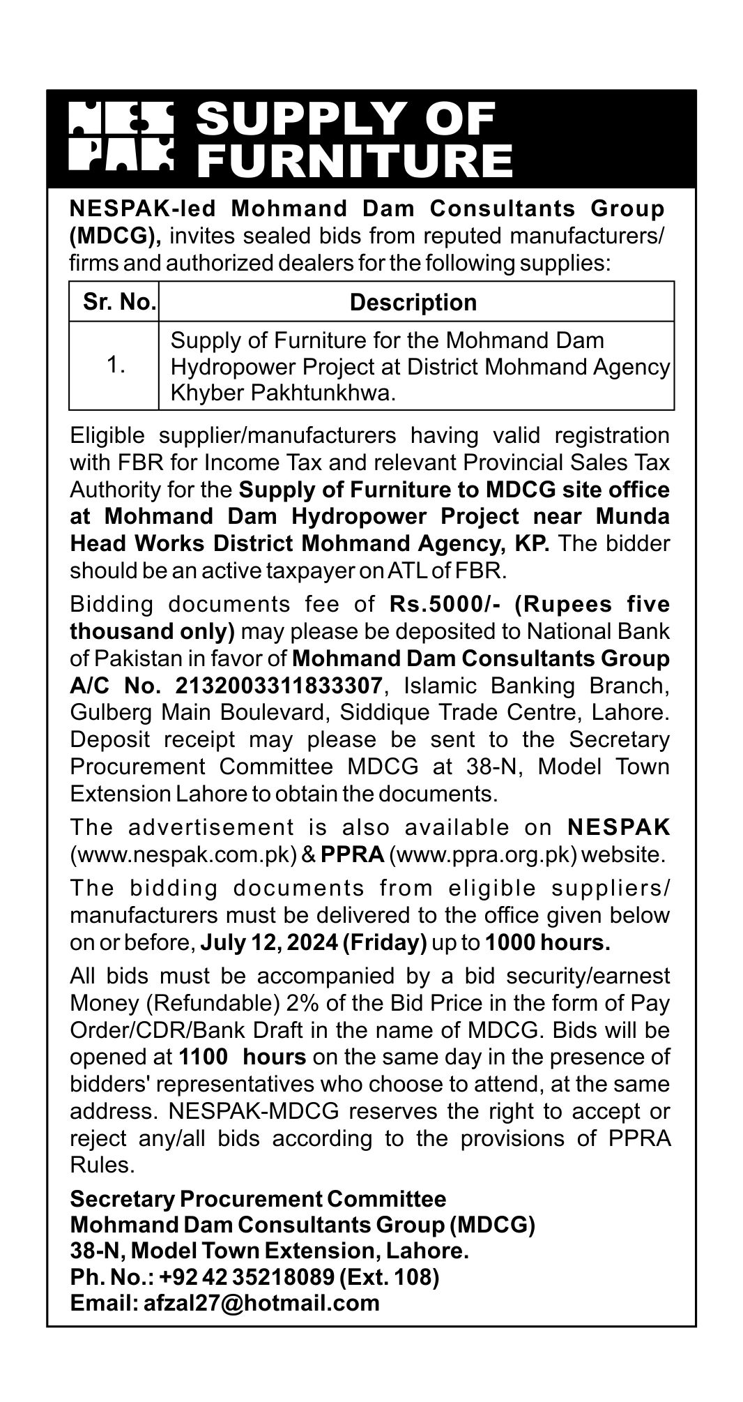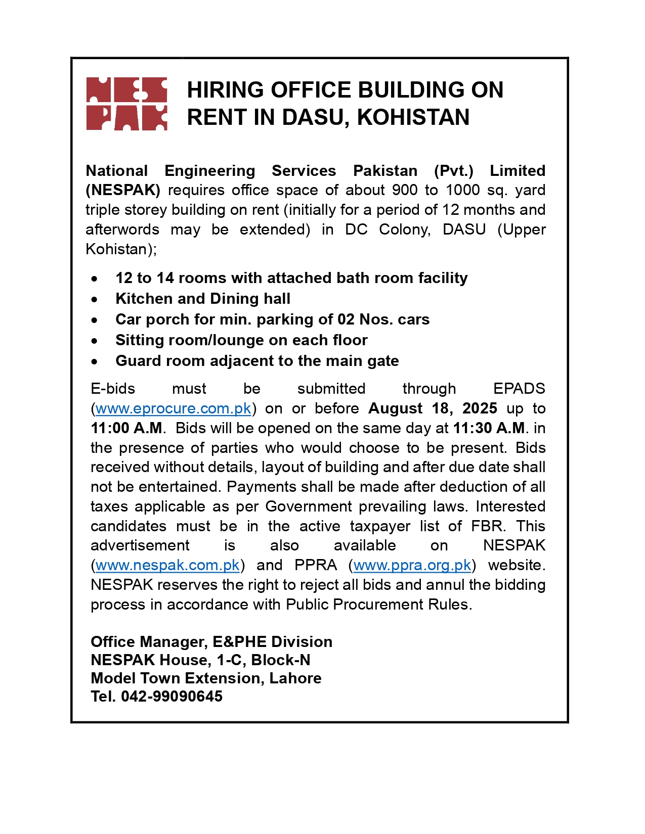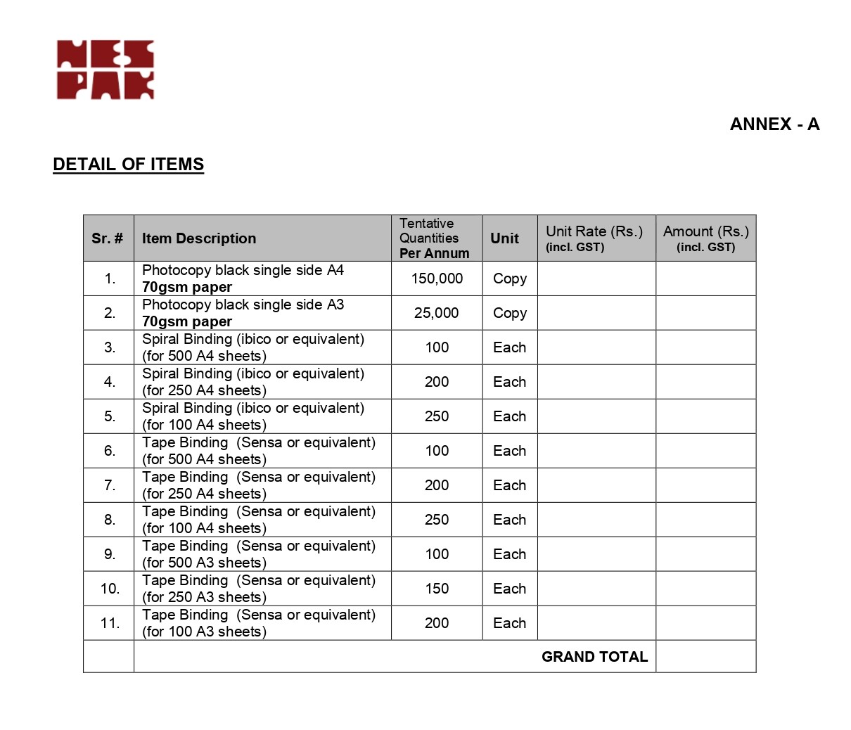 HIRING OF STATIONERY SUPPLIER FOR NESPAK HOUSE, ISLAMABAD