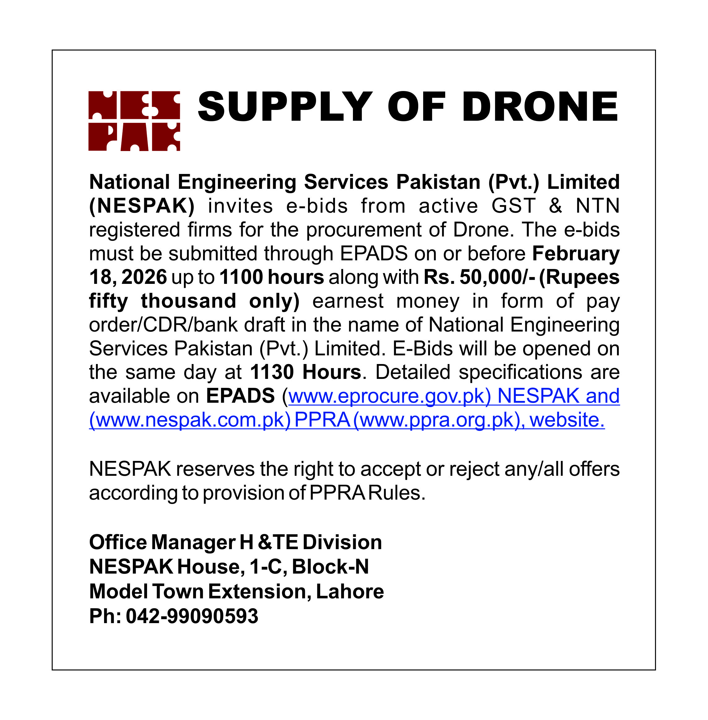 NOTICE INVITING E-BIDS BY NESPAK, SUPPLY OF DRONE