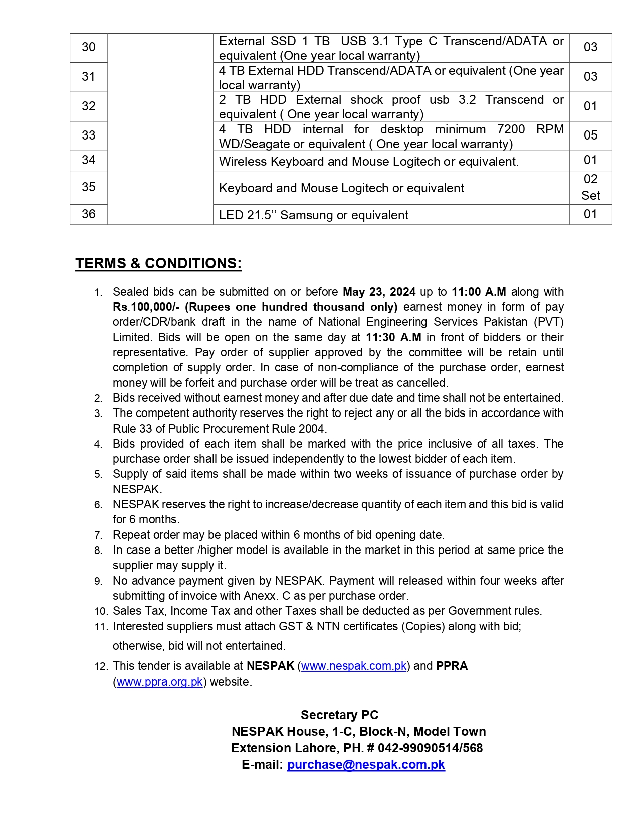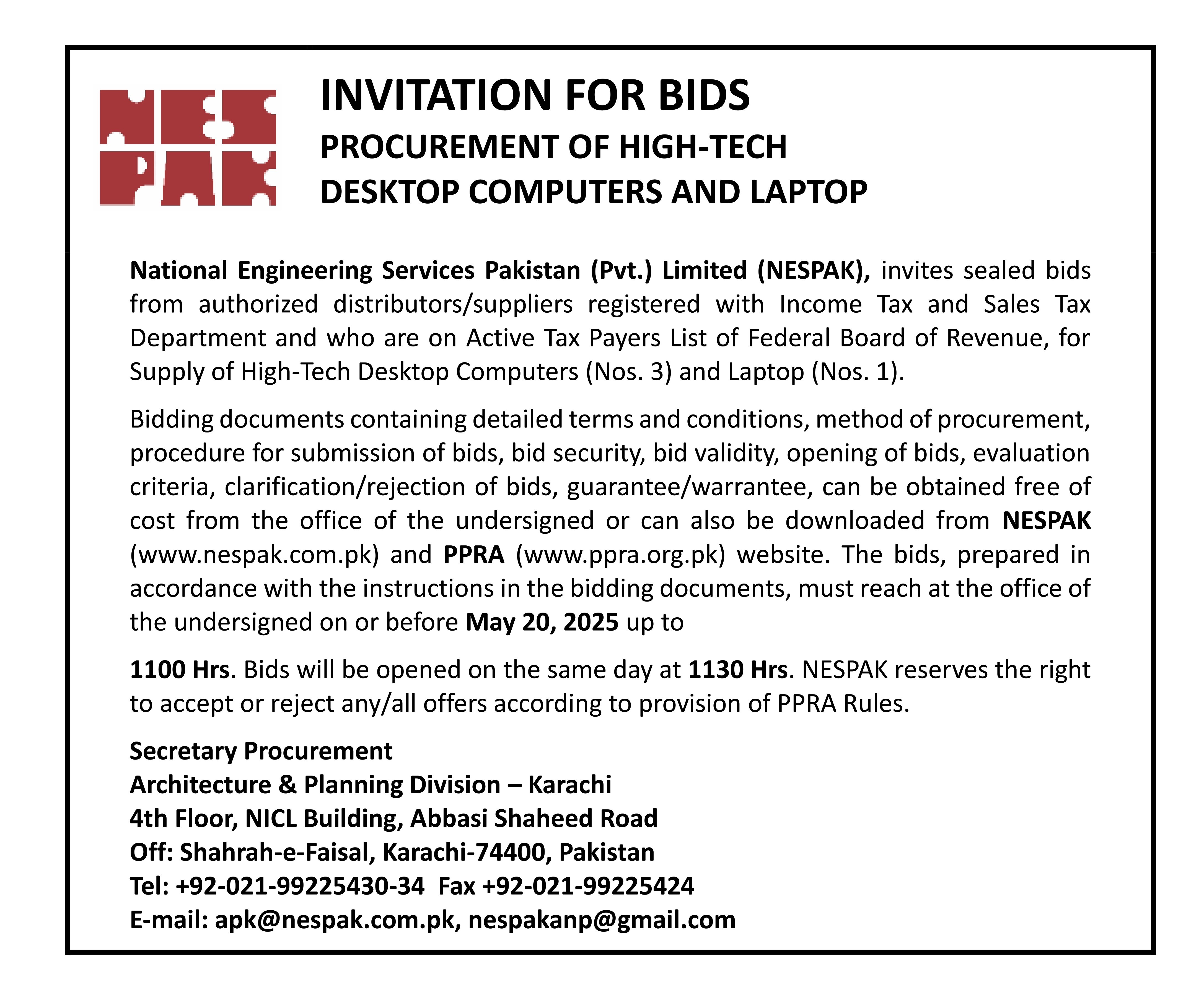 NOTICE INVITING E-BIDS BY NESPAK PURCHASE OF I.T EQUIPMENT (DESKTOP COMPUTERS AND LAPTOPS)