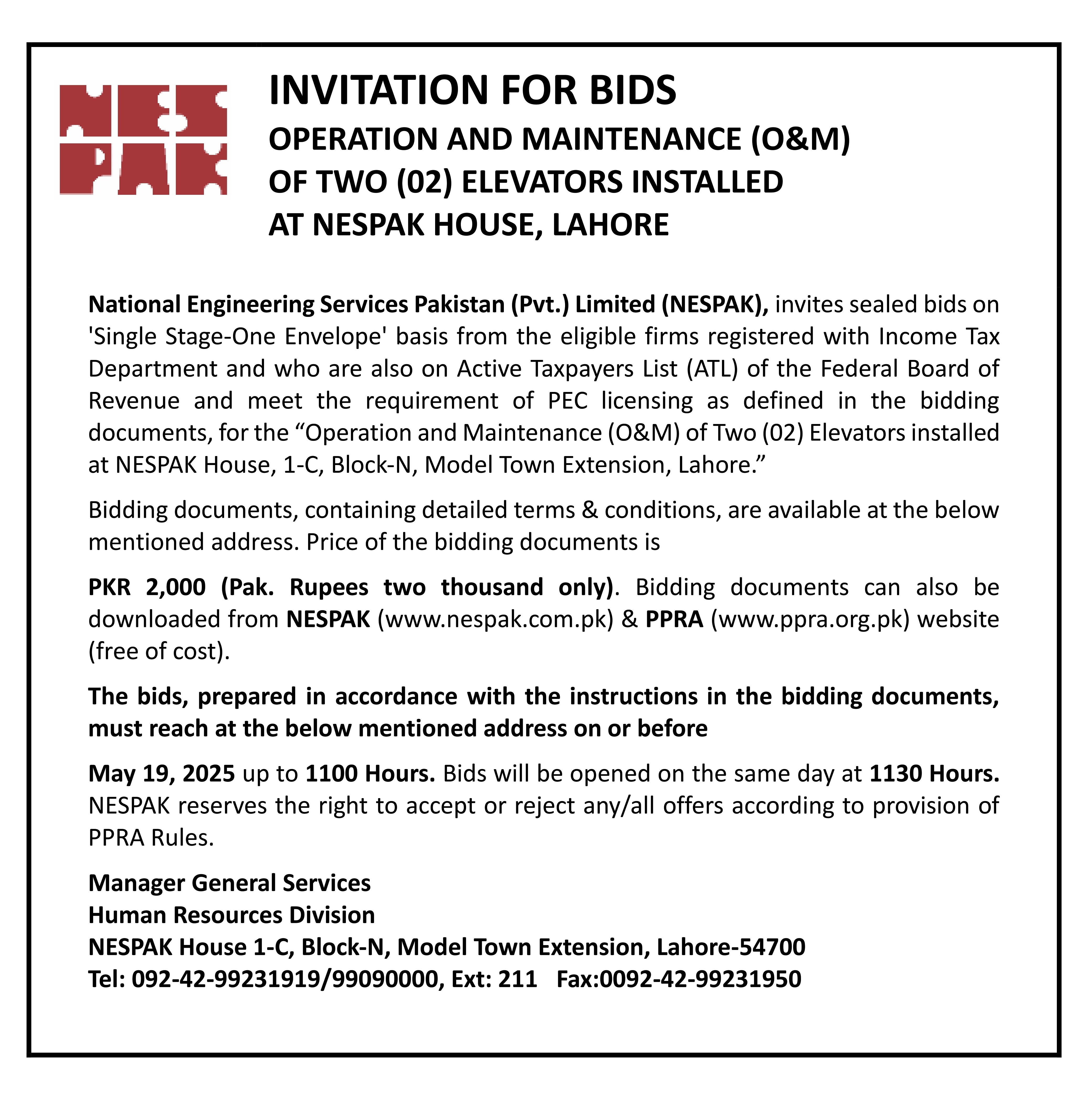 NVITATION FOR BIDS REPLACEMENT OF ELEVATOR CONTROLLER (630 Kg, Make: Sigma by Otis) INSTALLED AT NESPAK HOUSE LAHORE