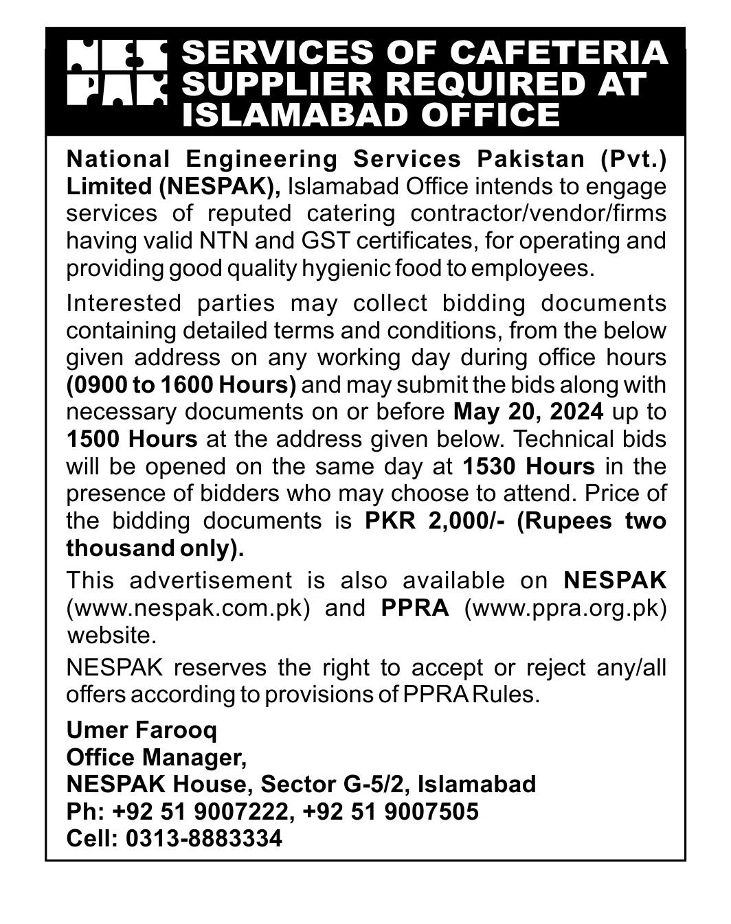 INVITATION OF BIDS CAFETERIA SERVICES AT NESPAK HOUSE