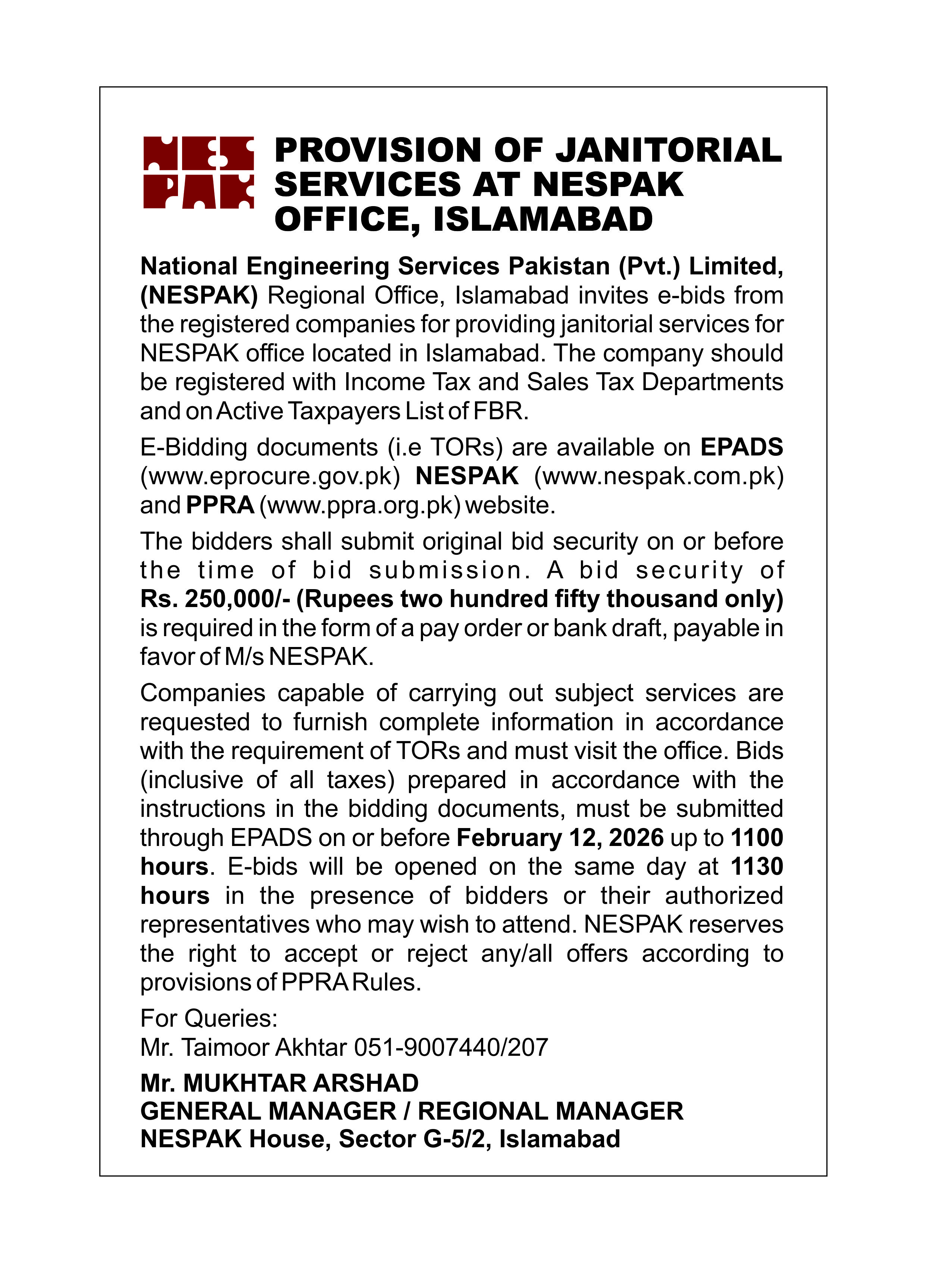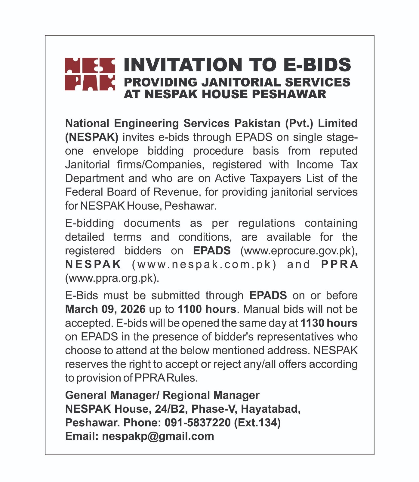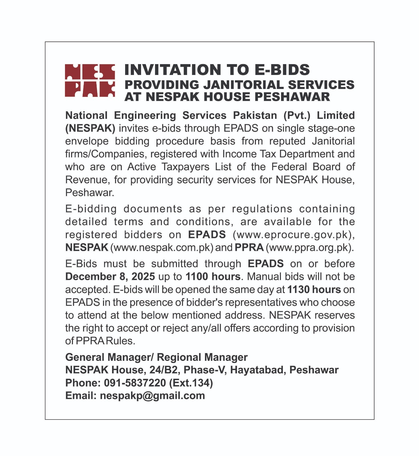 INVITATION TO E-BIDS (PROVIDING JANITORIAL SERVICES AT NESPAK HOUSE PESHAWAR)