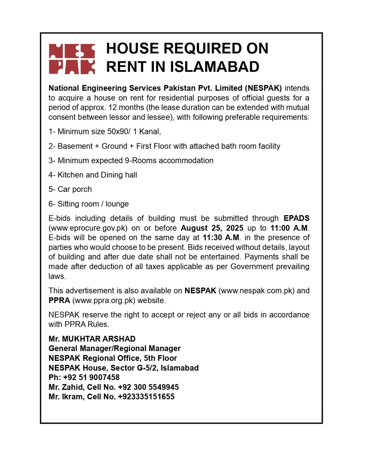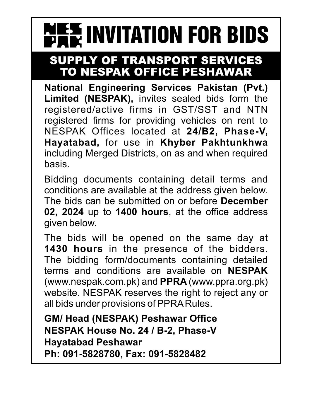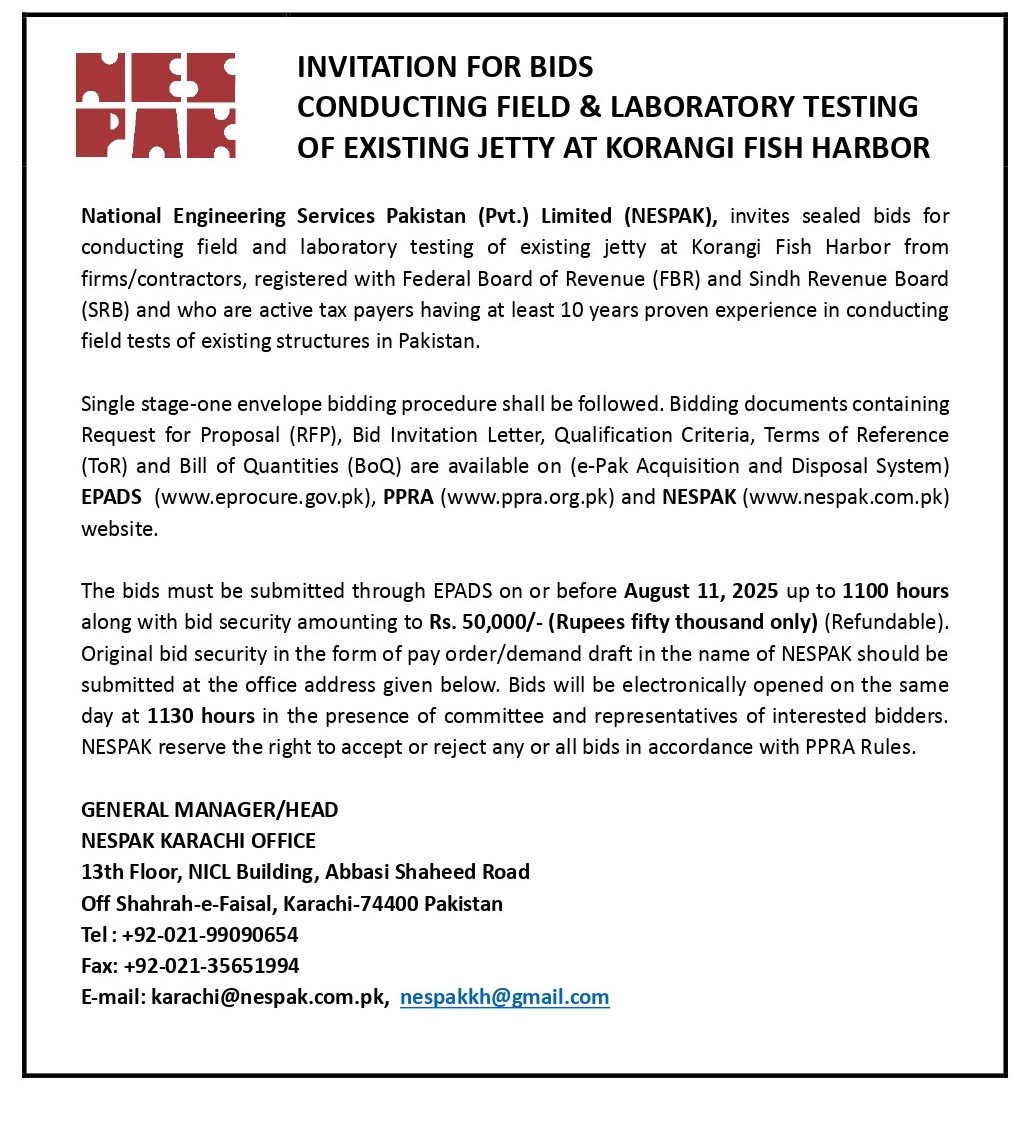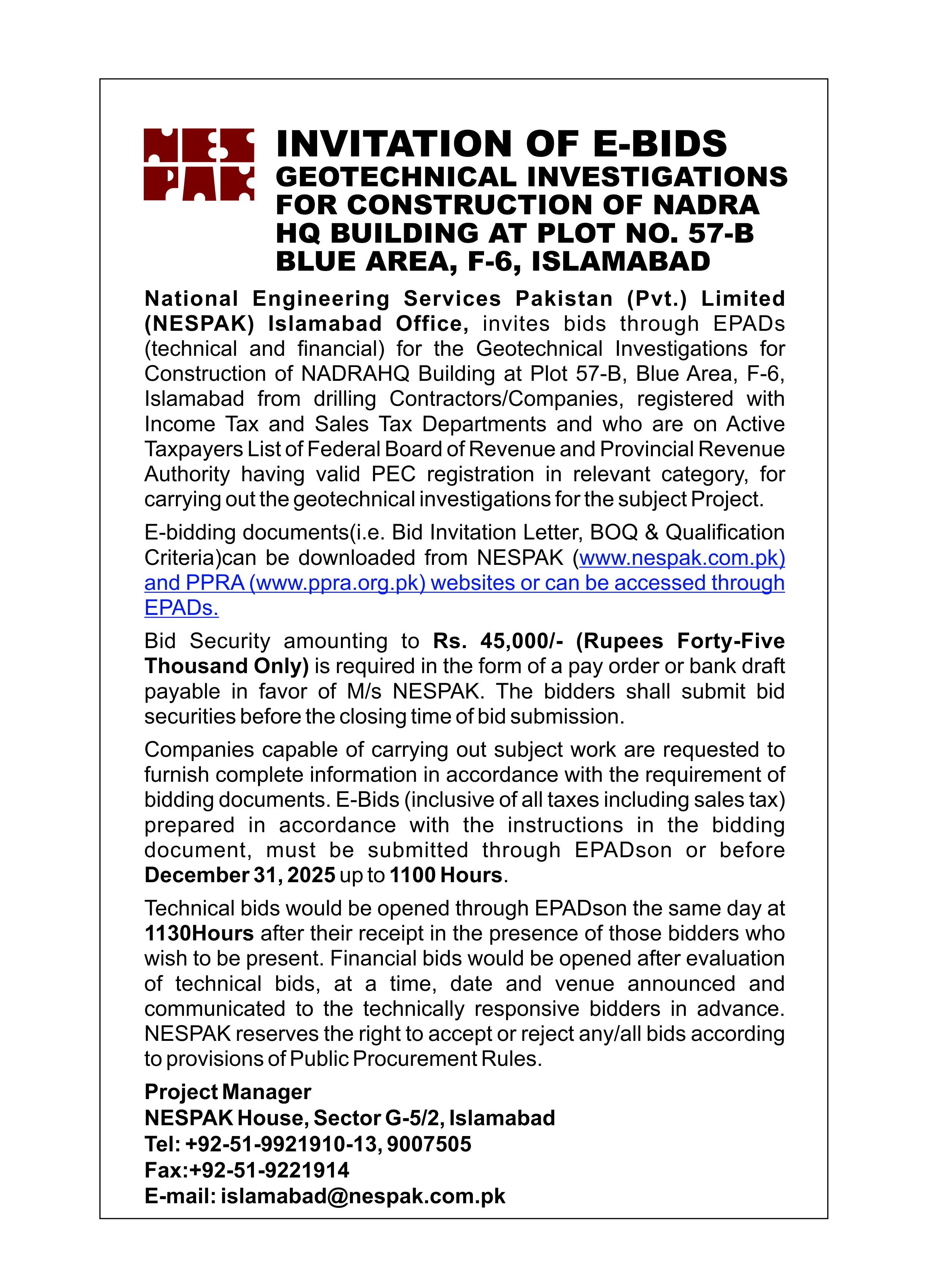 INVITATION TO E-BIDS (PROVIDING JANITORIAL SERVICES AT NESPAK HOUSE PESHAWAR)