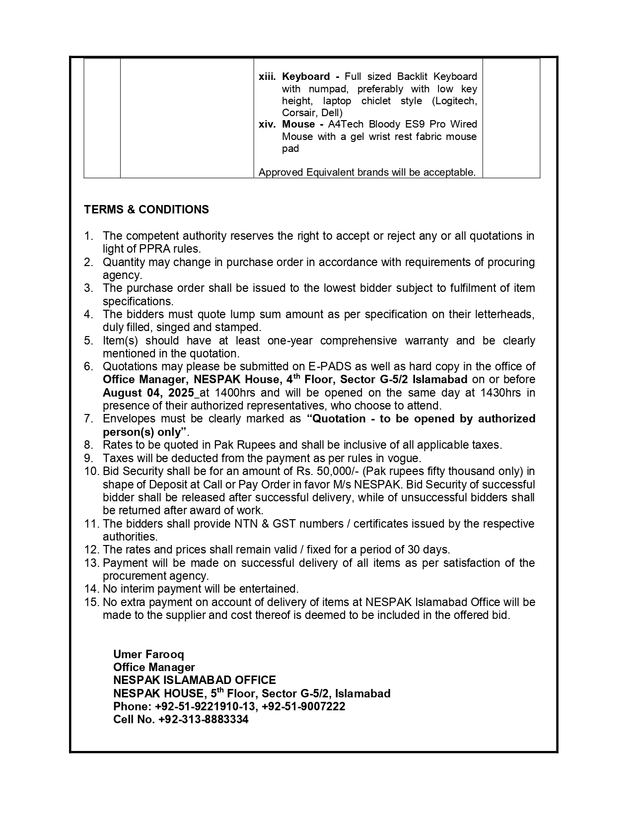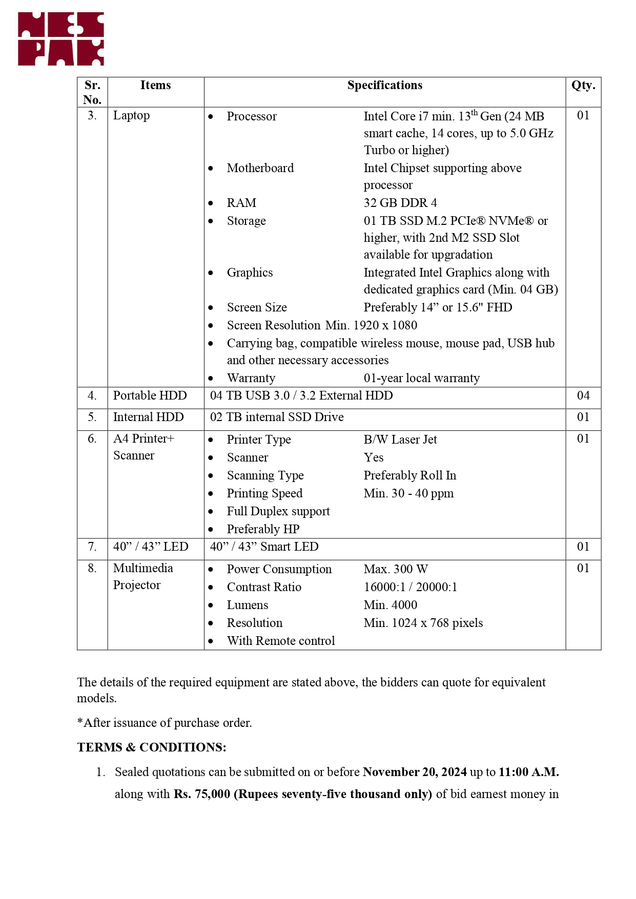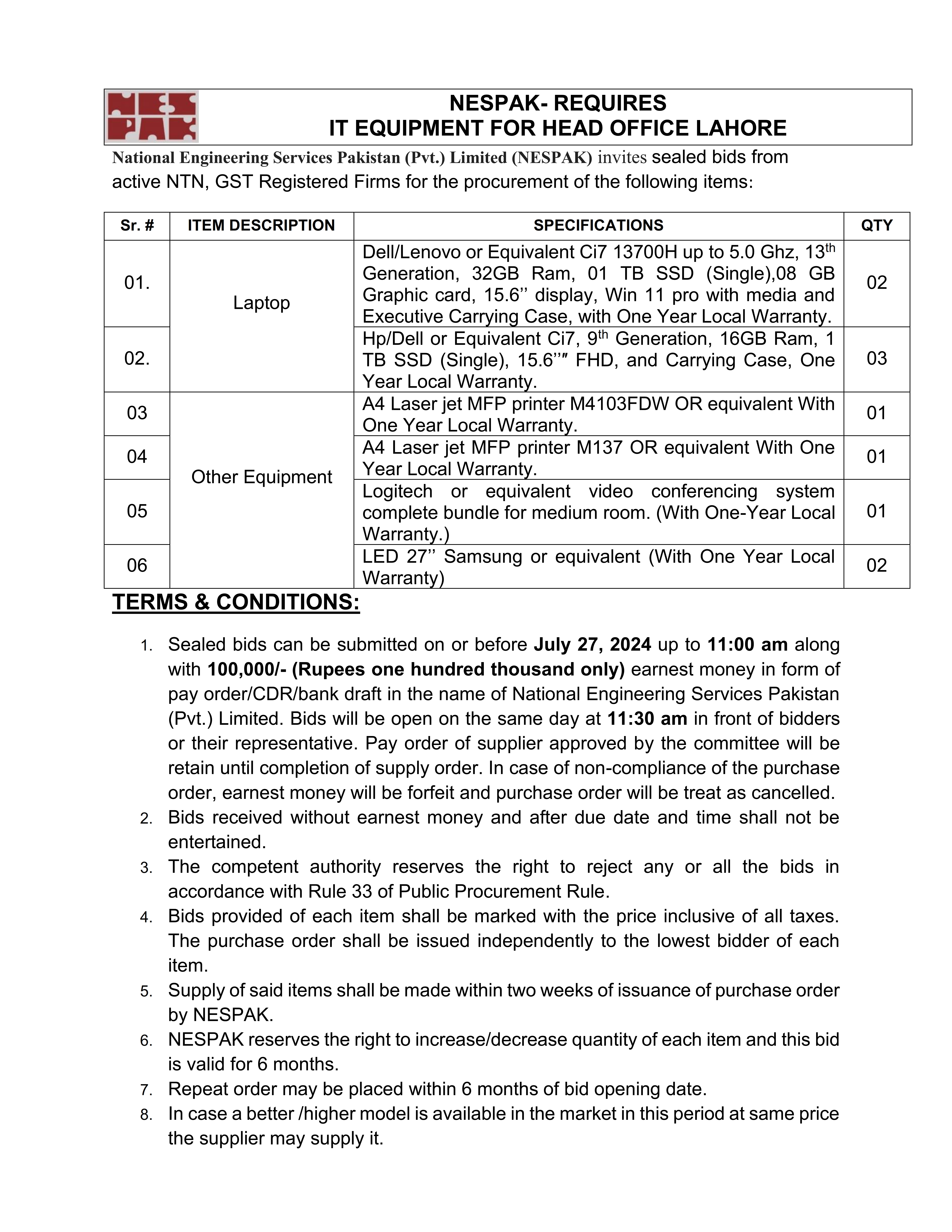 IT EQUIPMENT FOR NESPAK HEAD OFFICE LAHORE