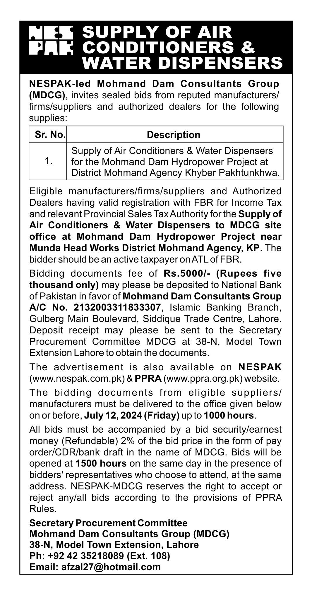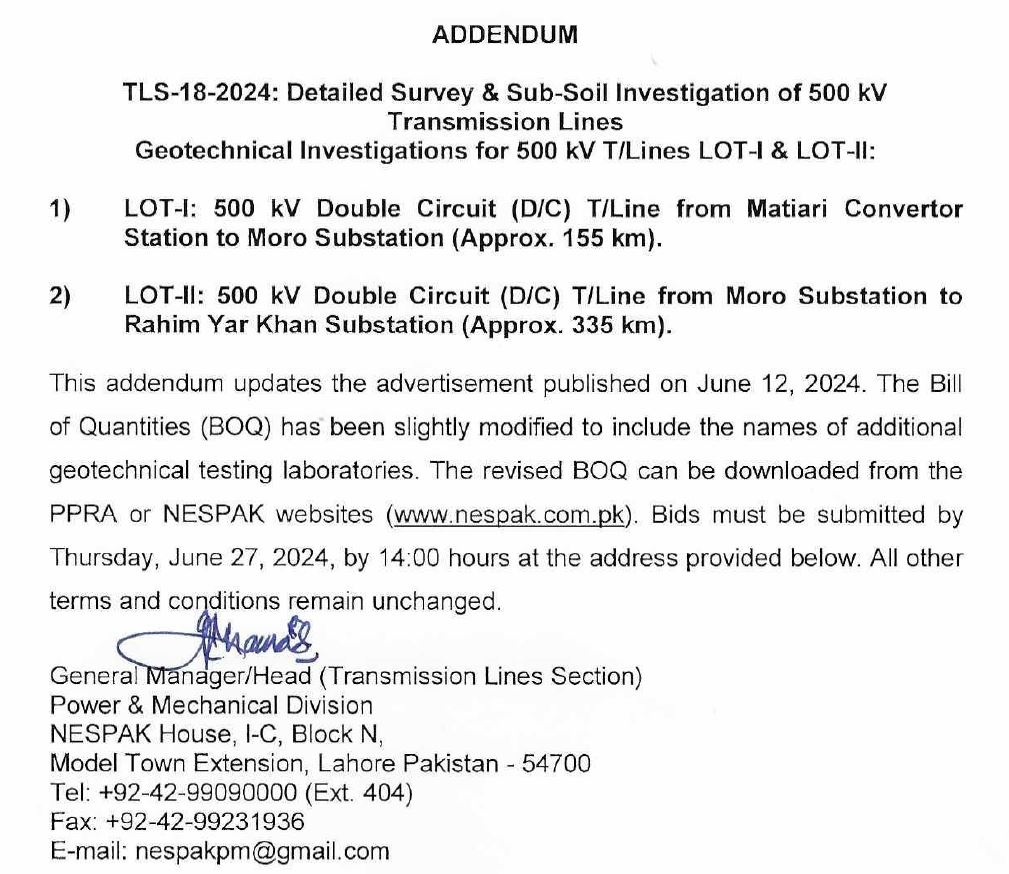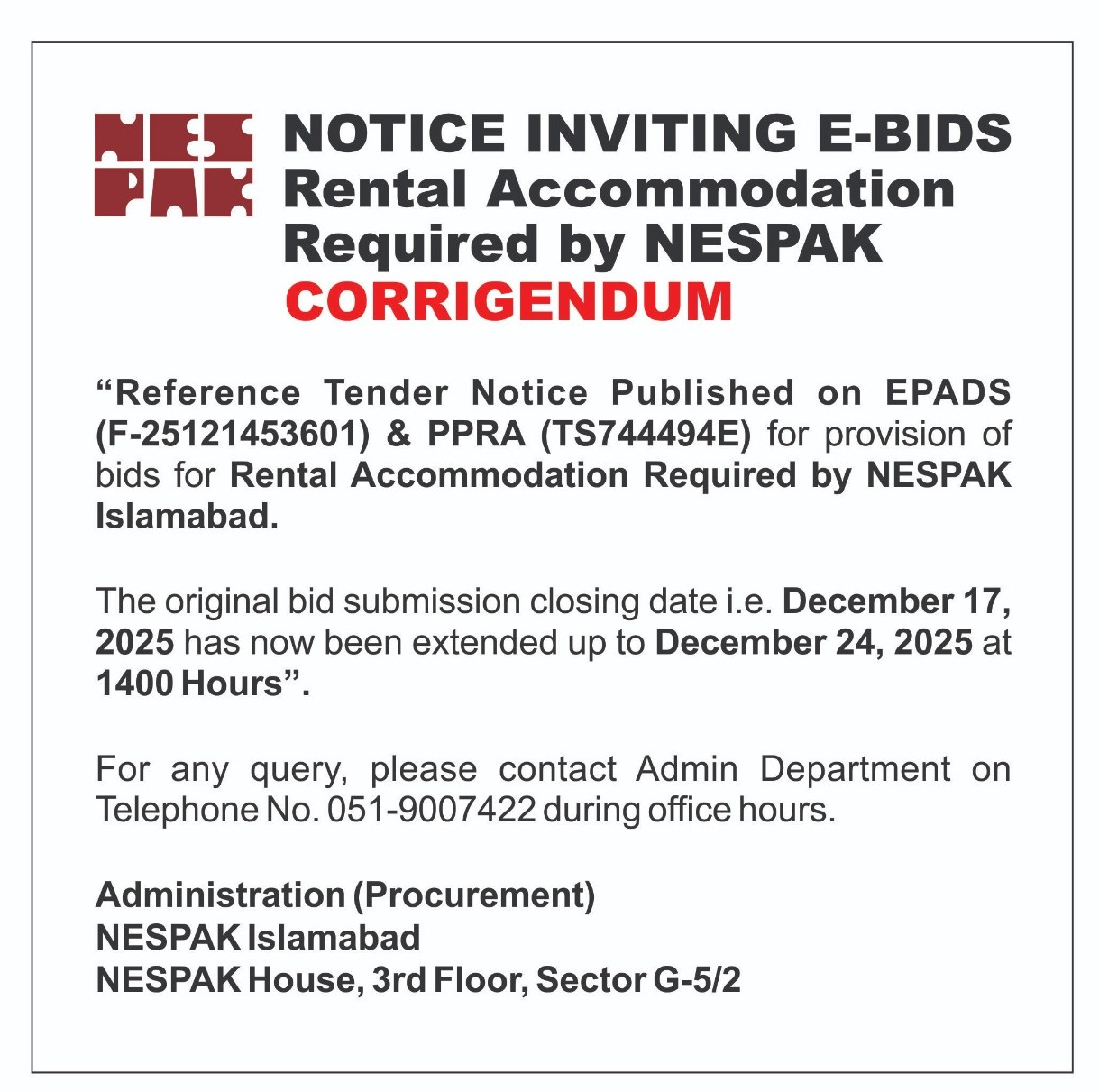 CORRIGENDUM REPLACEMENT, SUPPLY, INSTALLATION, TESTING & COMMISSIONING OF FIVE (5) NOS. AIR HANDLINING UNITS AT NESPAK HOUSE LAHORE EXTENSION IN BID SUBMISSION DEADLINE