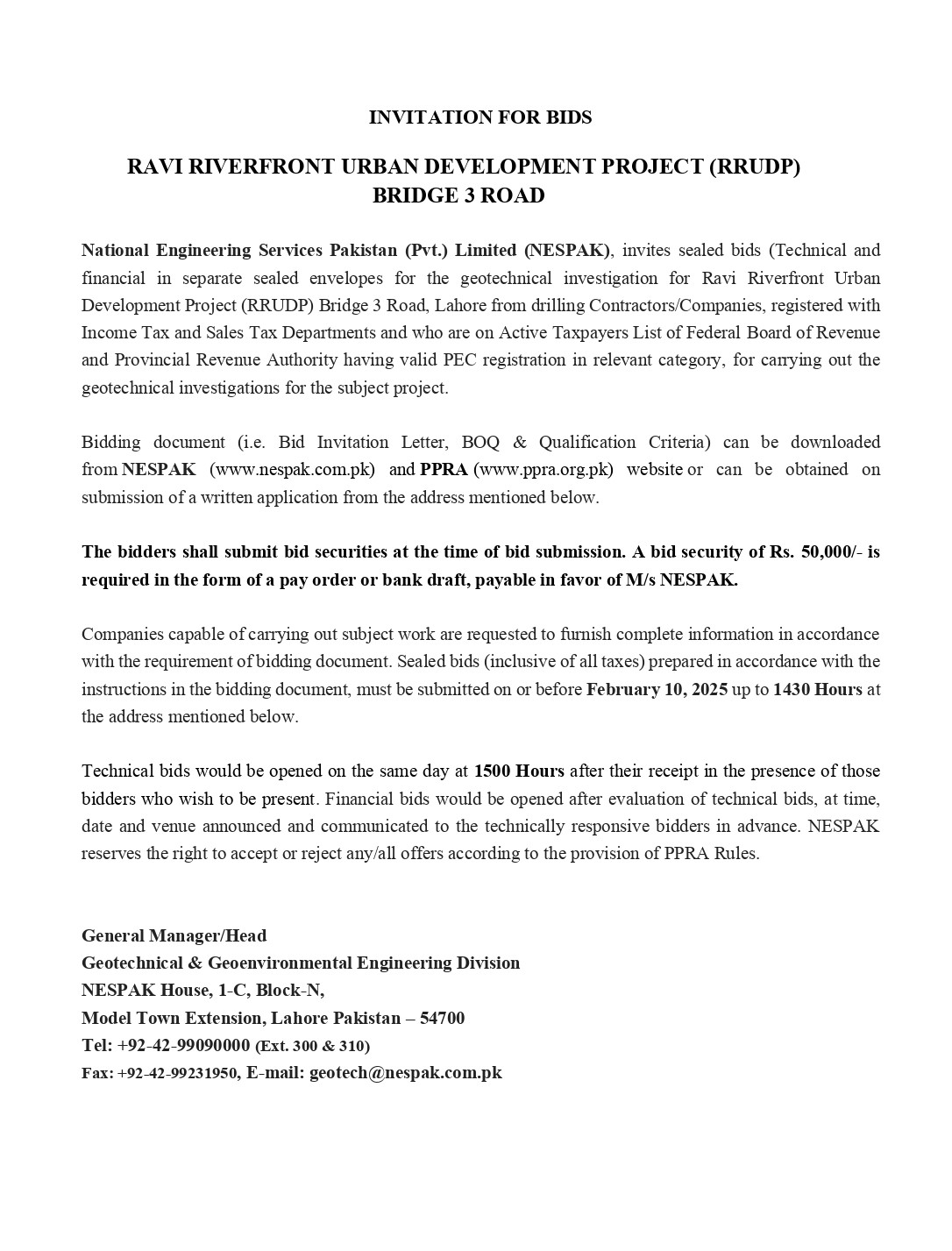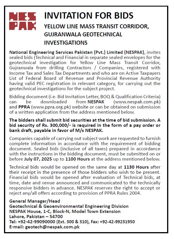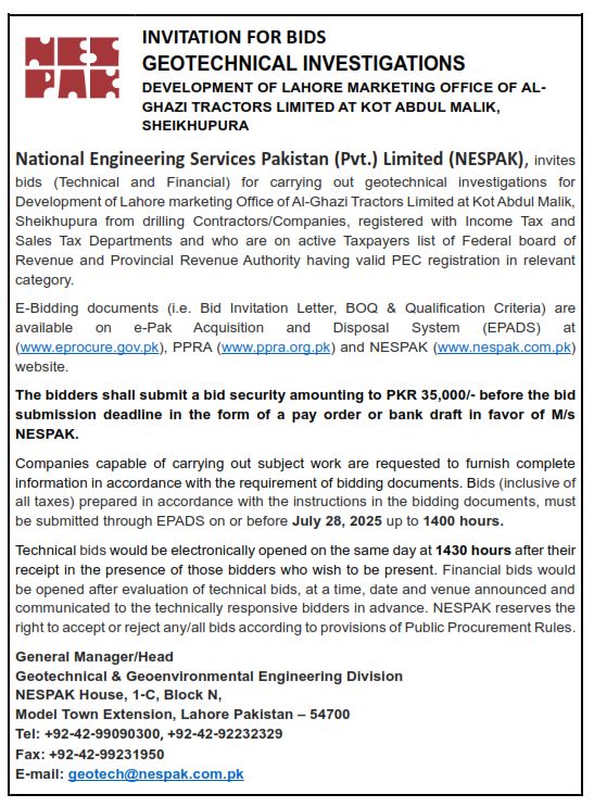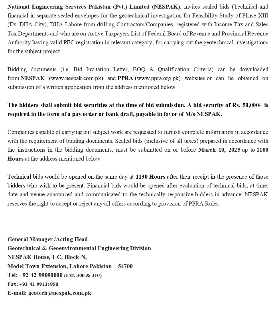 INVITATION OF BIDS FOR GEOTECHNICAL INVESTIGATIONS CONSTRUCTION OF ARTERIAL MAIN, SECONDARY AND DISTRIBUTION NETWORK IN THE AREAS IN THE EASTERN PART OF FAISALABAD CITY