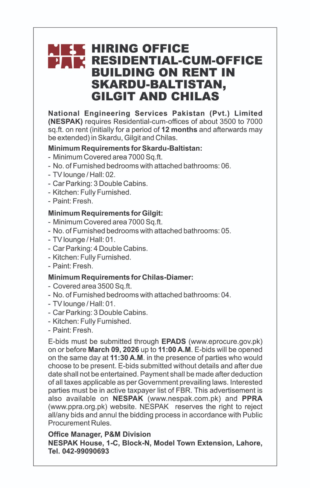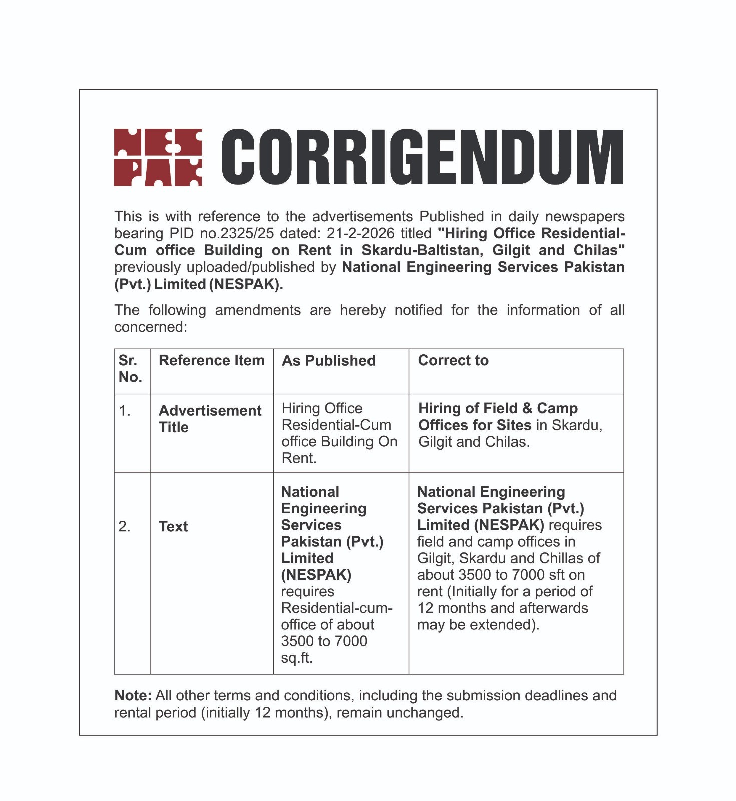 CORRIGENDUM HIRING OF FIELD & CAMP OFFICES FOR SITES IN SKARDU, GILGIT AND CHILAS.