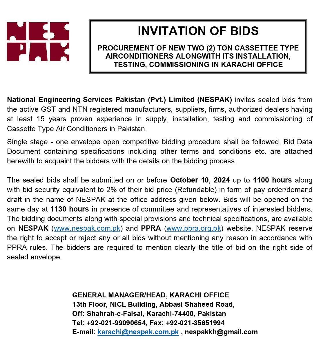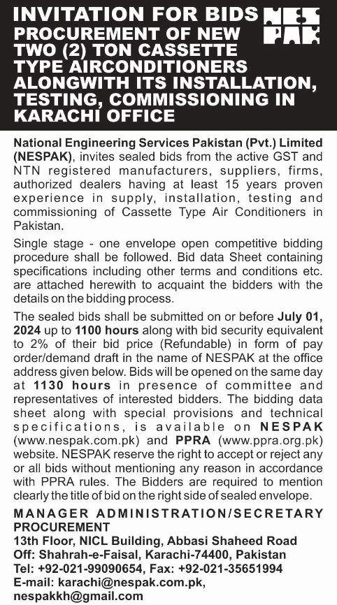 ADVERTISEMENT FOR REPLACEMENT, SUPPLY, INSTALLATION, TESTING & COMMISSIONING OF FIVE (5) NOs. AIR HANDLING UNITS AT NESPAK HOUSE, LAHORE