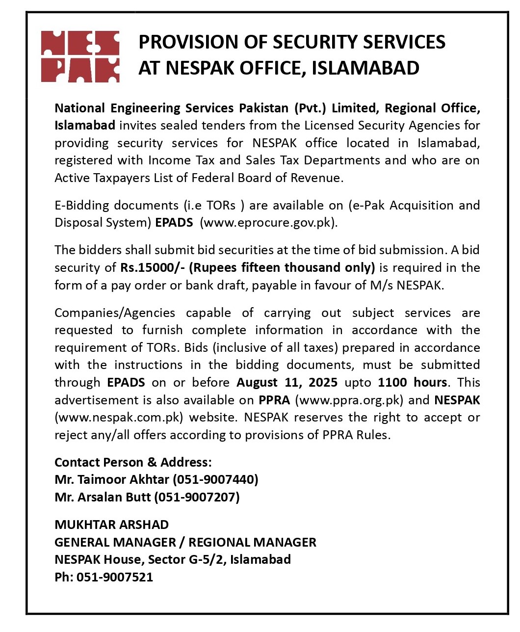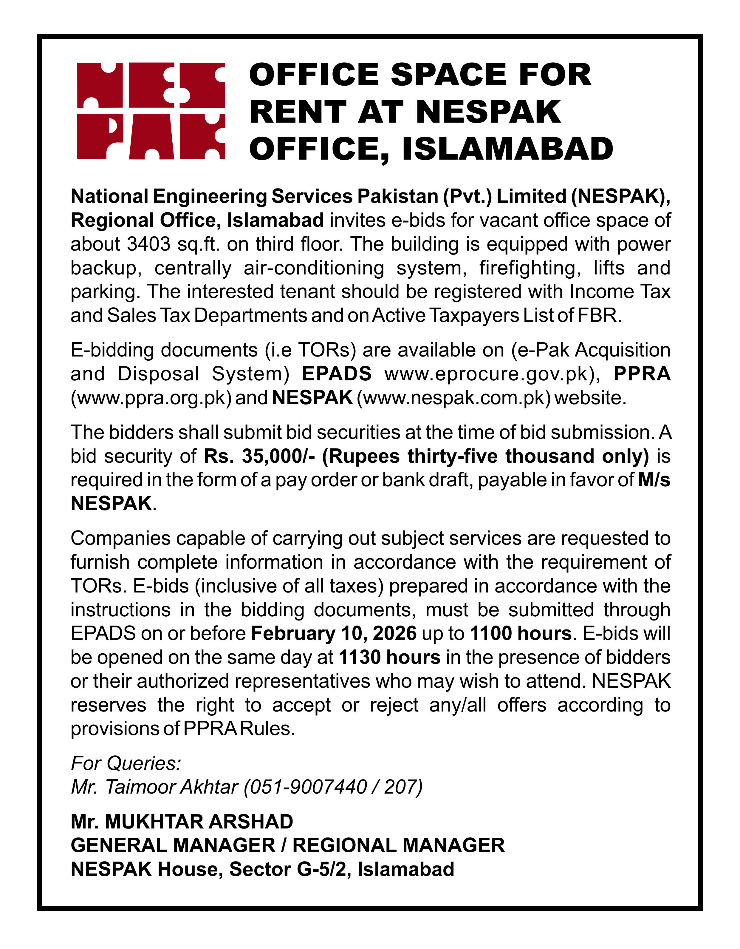 PROVISION OF JANITORIAL SERVICES AT NESPAK OFFICE, ISLAMABAD (CORRIGENDUM)