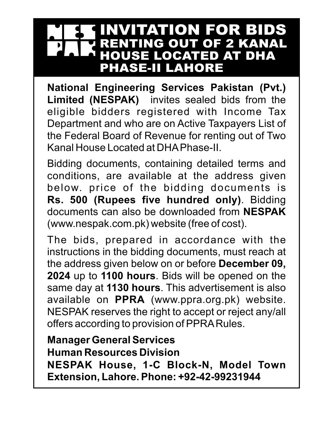 INVITATION FOR BIDS SALE OF 2 KANAL HOUSE LOCATED AT DHA PHASE-II LAHORE